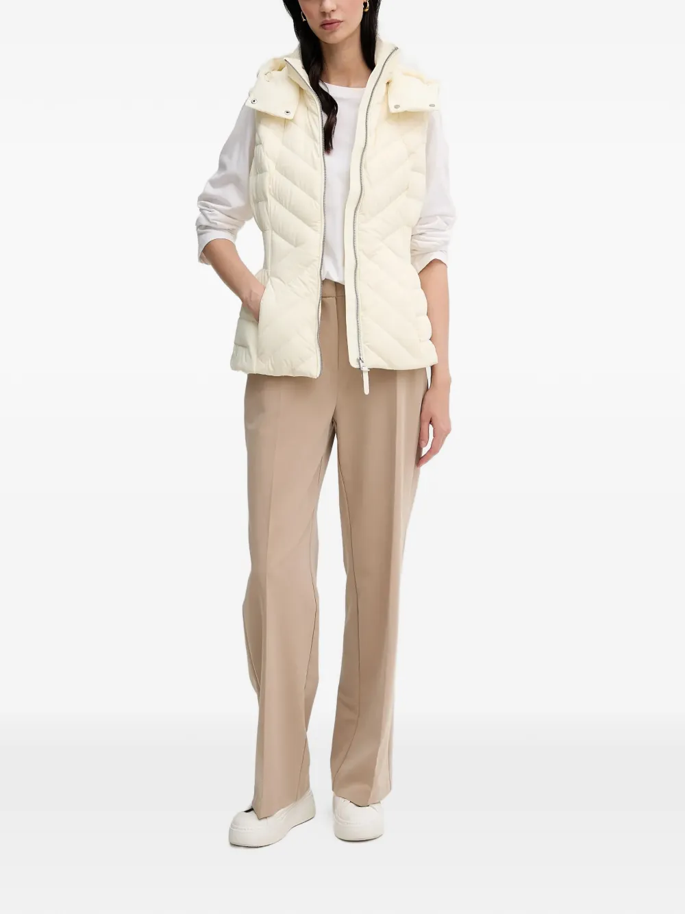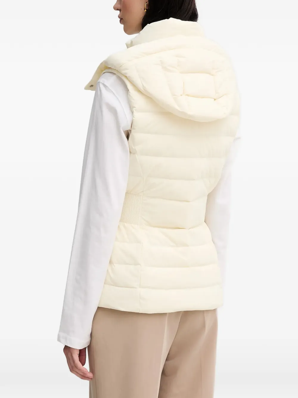 Кремовая стеганая безрукавка с капюшоном, серебристой фурнитурой и застежкой-молнией спереди