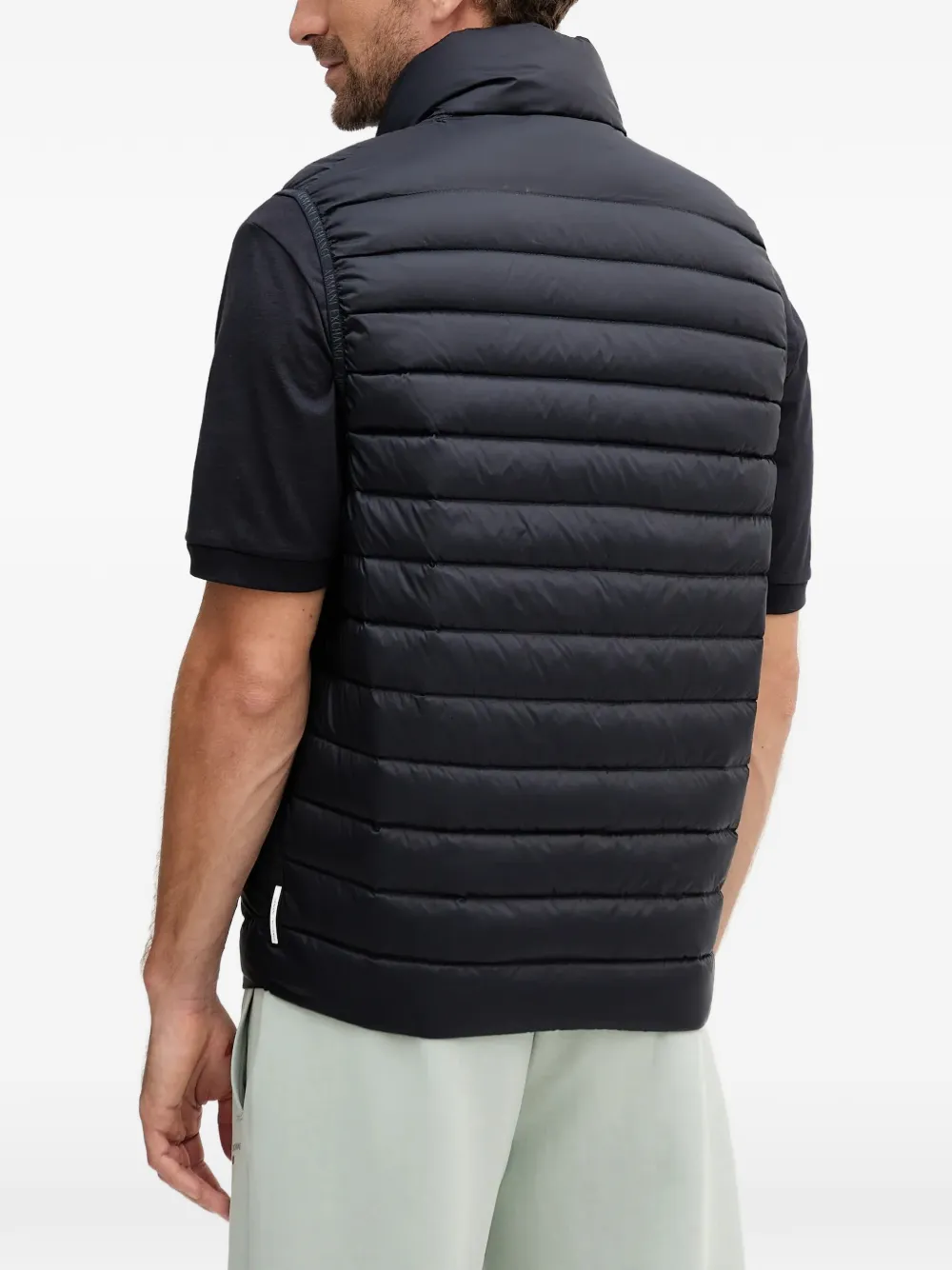 Синий жилет с горизонтальной стежкой, застежкой-молнией, высоким воротником, логотипом, без рукавов и карманами
