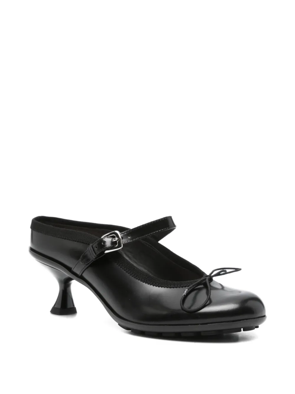 Черный цвет, полированное покрытие, ремешок с пряжкой в виде банта, скульптурный каблук, круглый носок