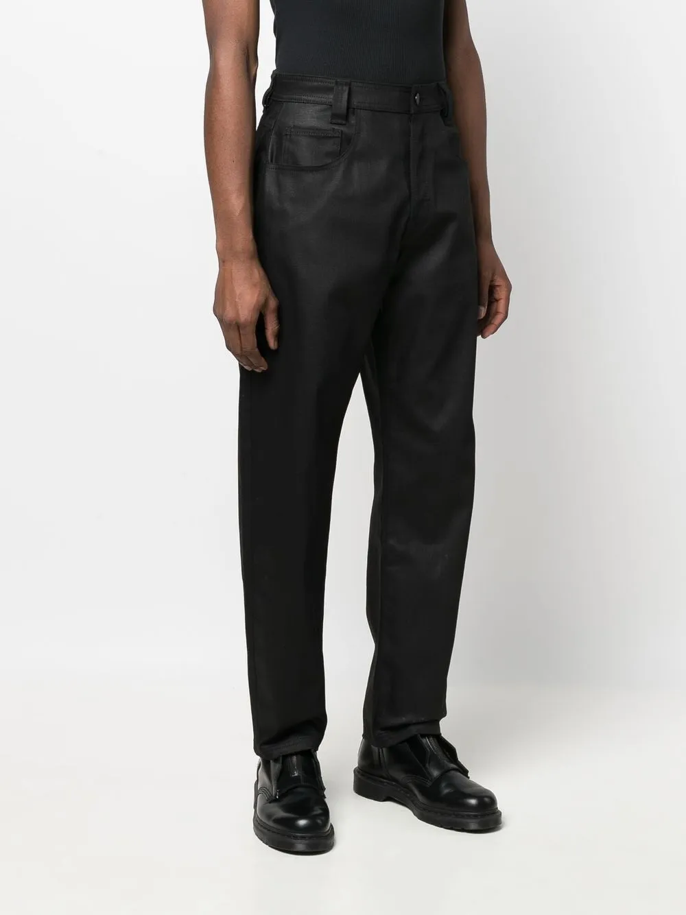 Черный, смесовый хлопок, завышенная талия, застежка на молнии и пуговице спереди, петли для ремня, классическая пятикарманная модель и прямой крой. Это унисекс-модель. Обратите внимание, что для нее используется мужская размерная сетка.