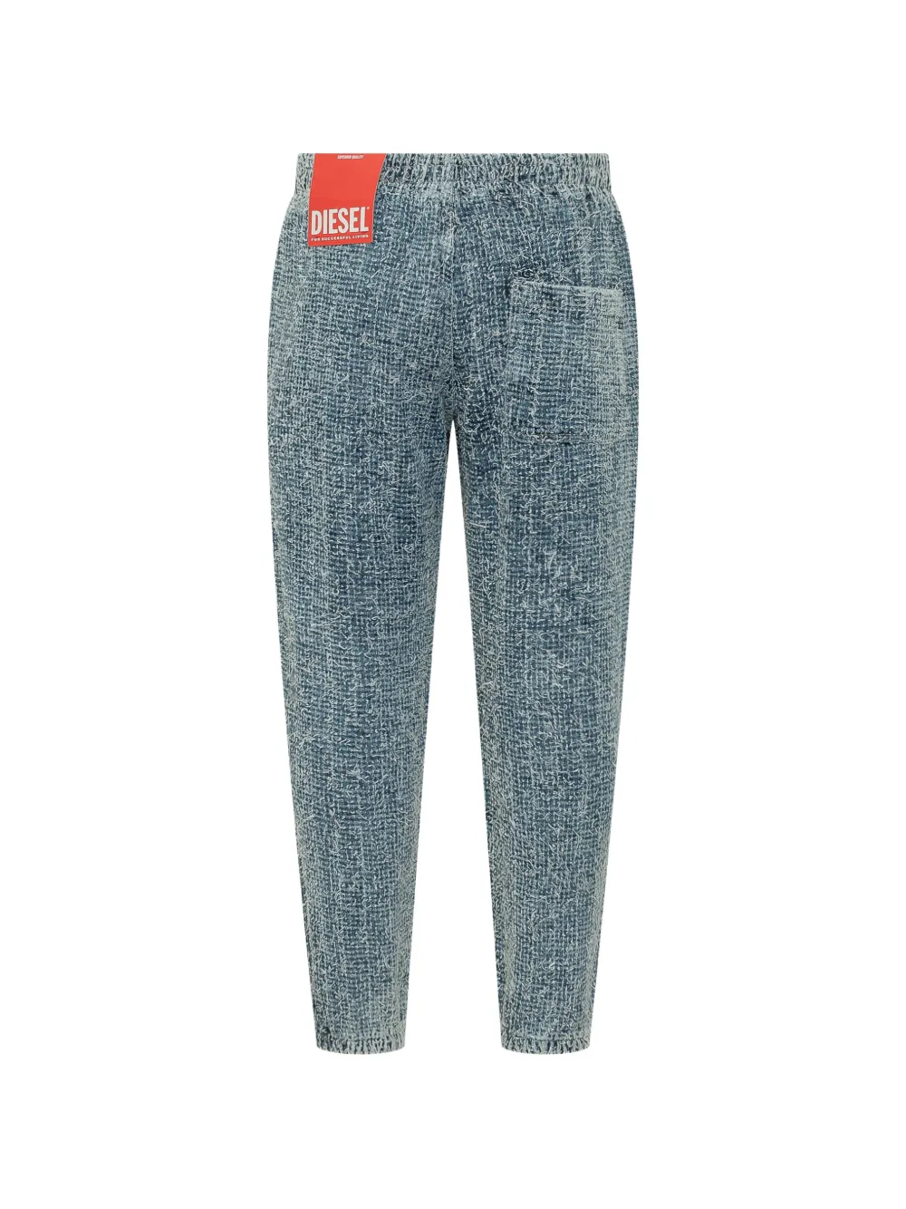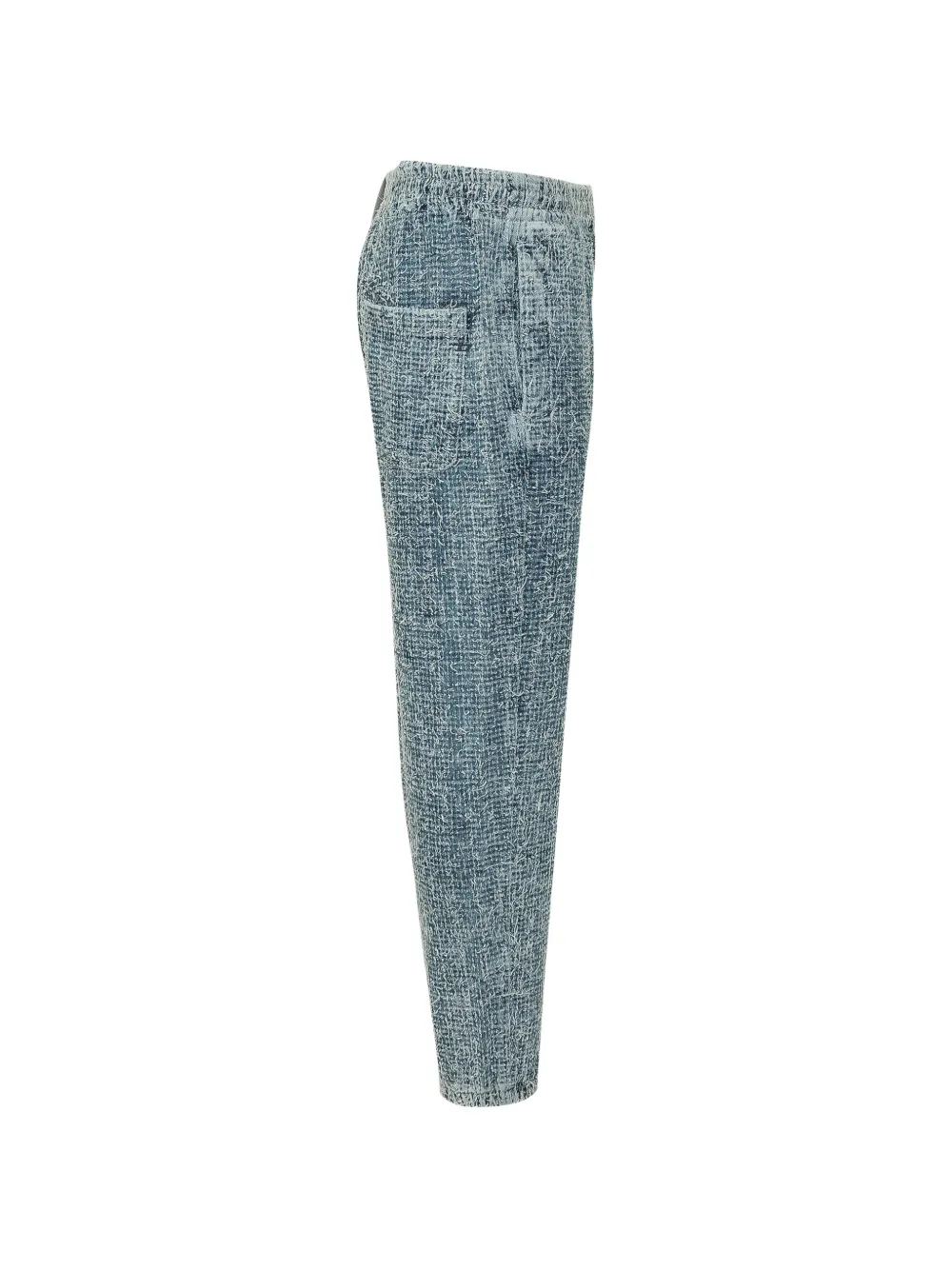 Джинсово-синий, эластичный пояс, задний накладной карман, фактурный