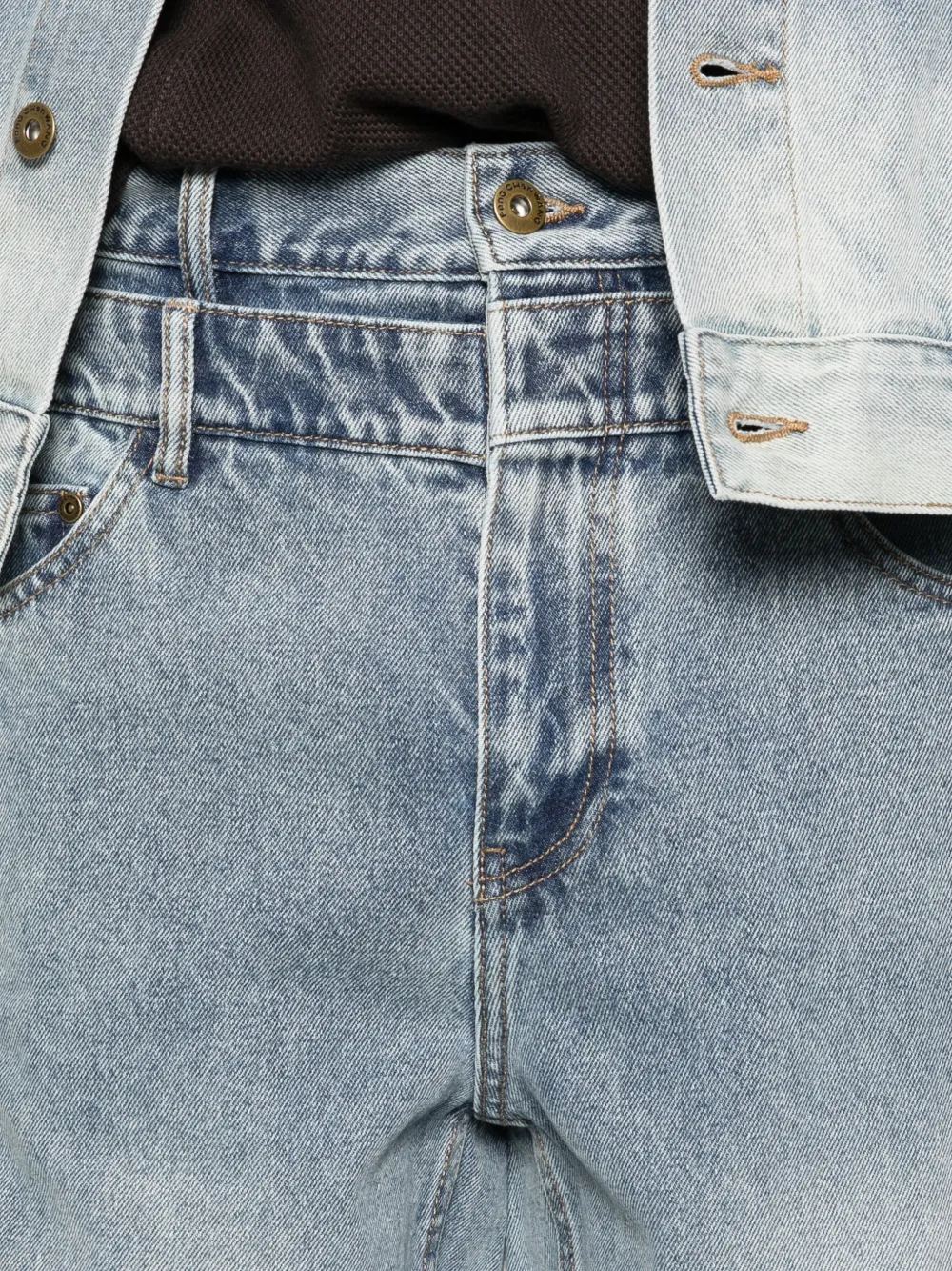 Синие швы, эффект потертости, шлевки для ремня, застежка на пуговицу, пять карманов