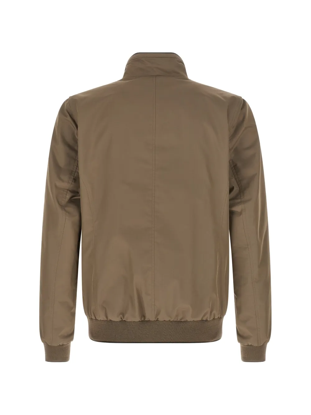 Коричневый цвет, стойка-воротник, застежка-молния спереди, прорезные карманы на молнии, длинные рукава, рукава с манжетами