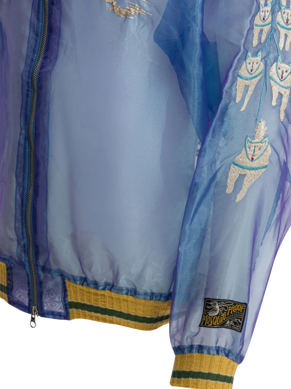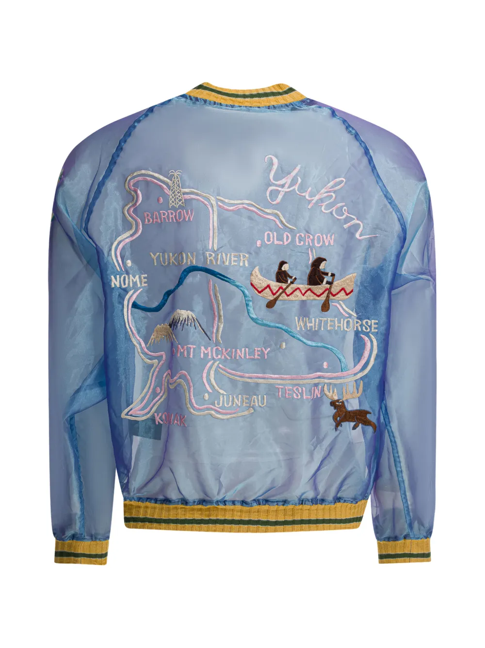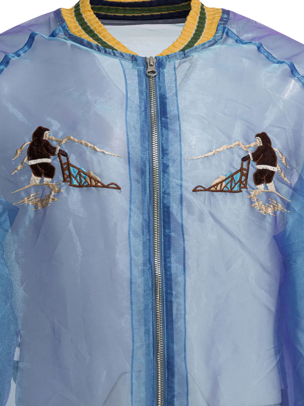 Светло-голубой цвет, резинка в рубчик, застежка на молнию, длинные рукава, вышивка с изображением карты, графическая вышивка
