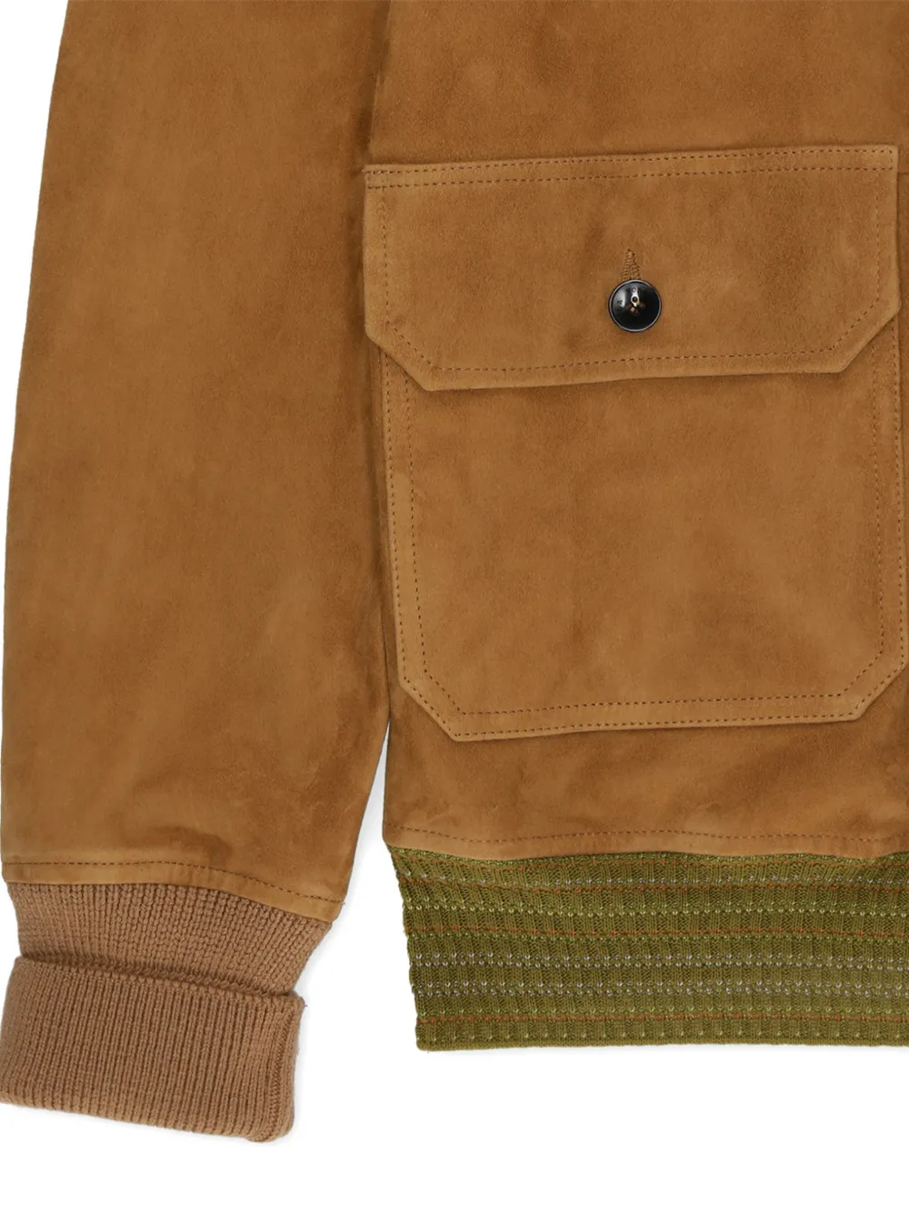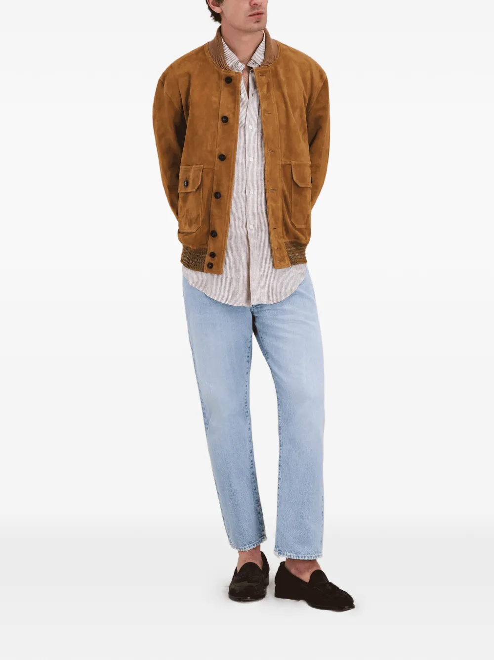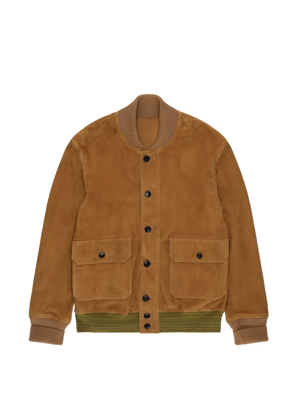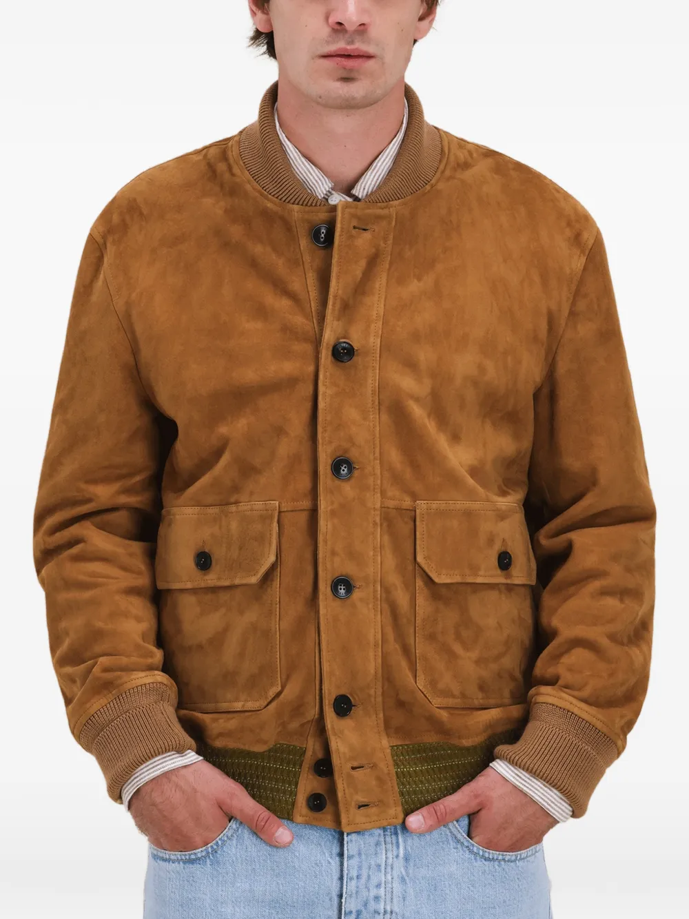 Коричневая кожаная куртка с ребристыми краями, застежкой на пуговицы, накладными карманами с клапанами и длинными рукавами