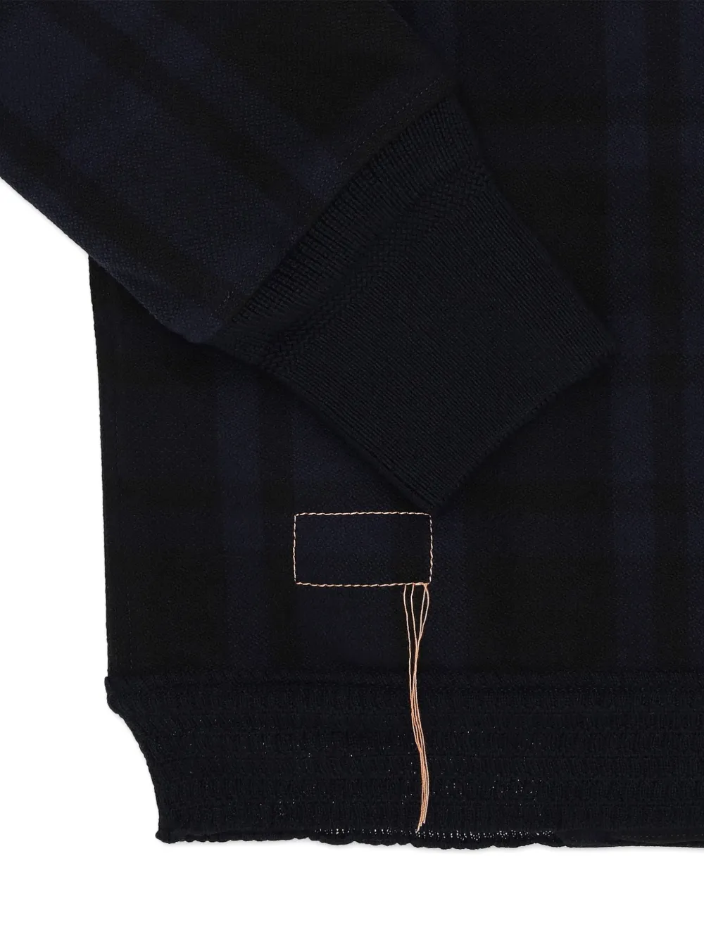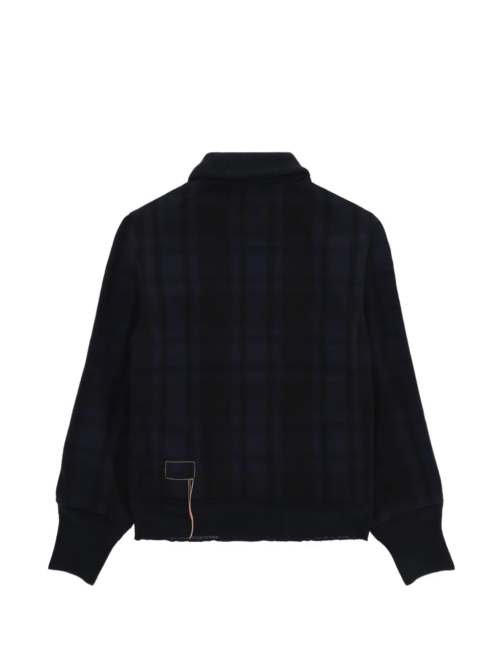 Темно-синий цвет, клетчатый узор, застежка на пуговицы спереди, два накладных кармана спереди, длинные рукава, манжеты в рубчик