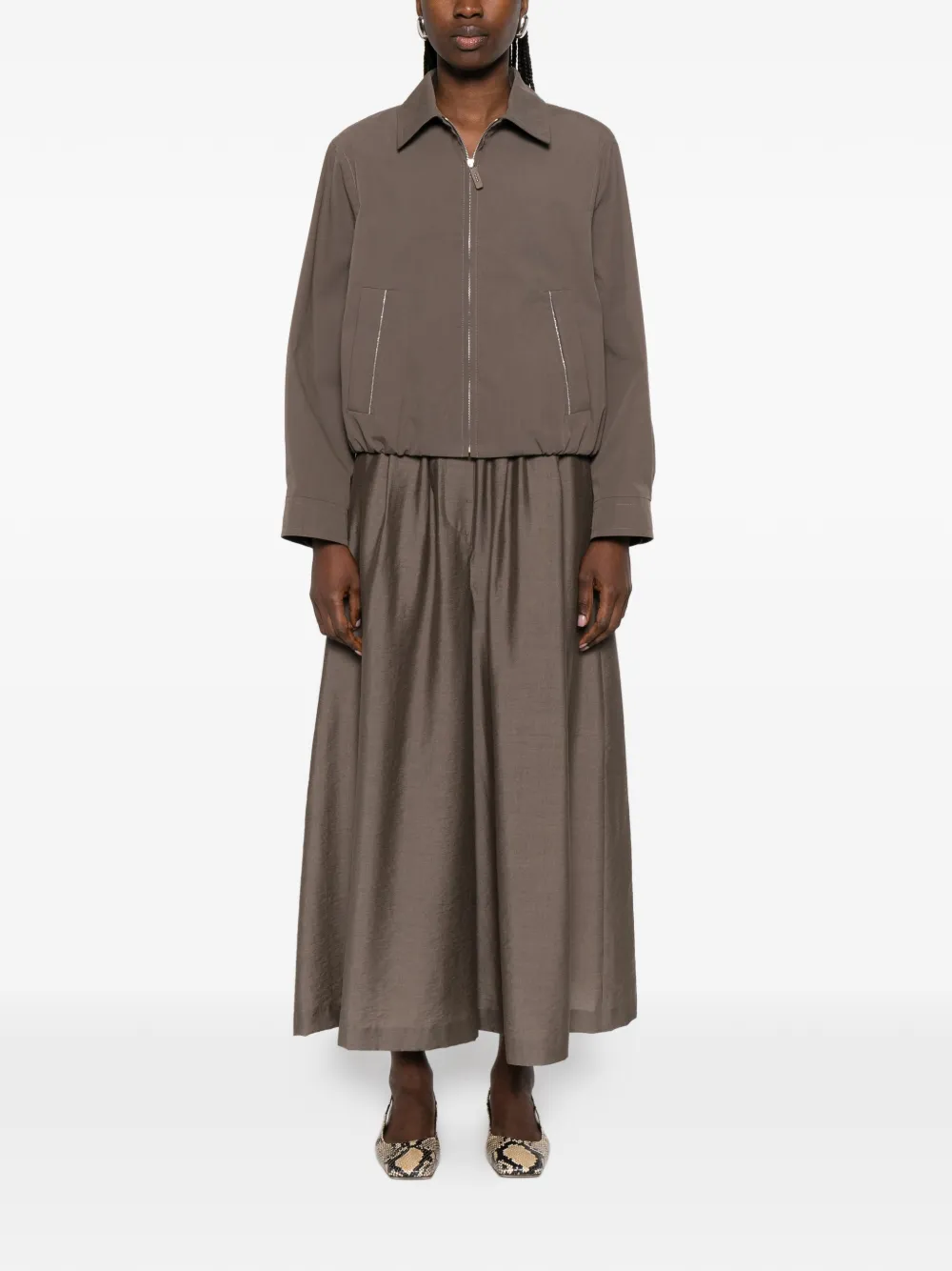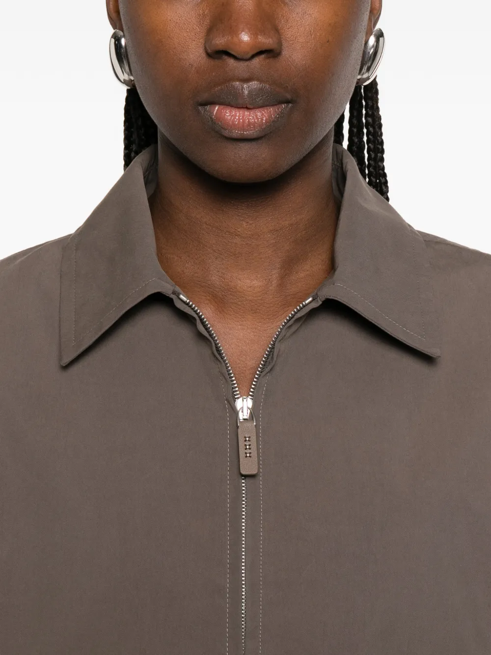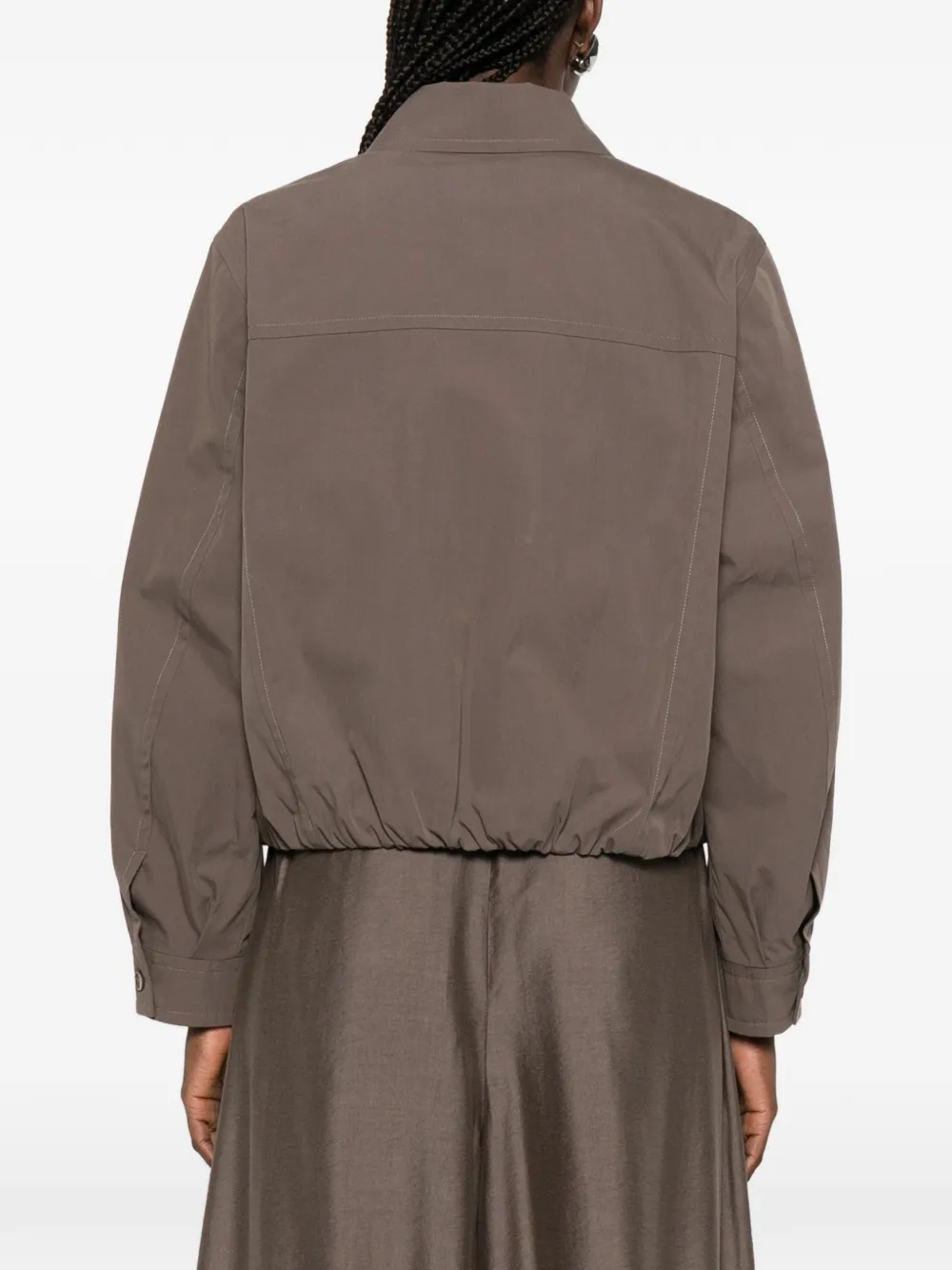 Коричневый цвет, застежка-молния спереди, отложной воротник, два передних кармана, длинные рукава, эластичный нижний край