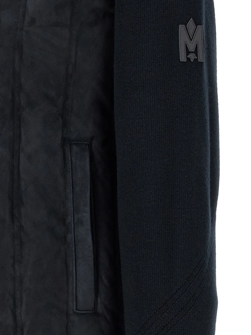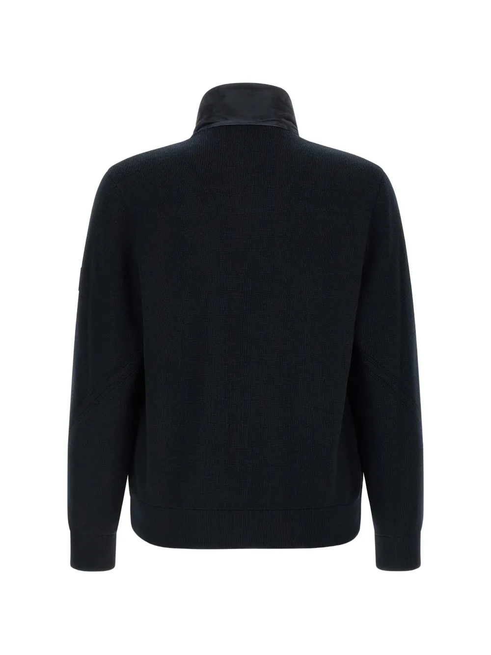 Синий вязаный свитер с воротником-стойкой, нашивкой с логотипом, застежкой-молнией, карманами и рукавами на манжетах