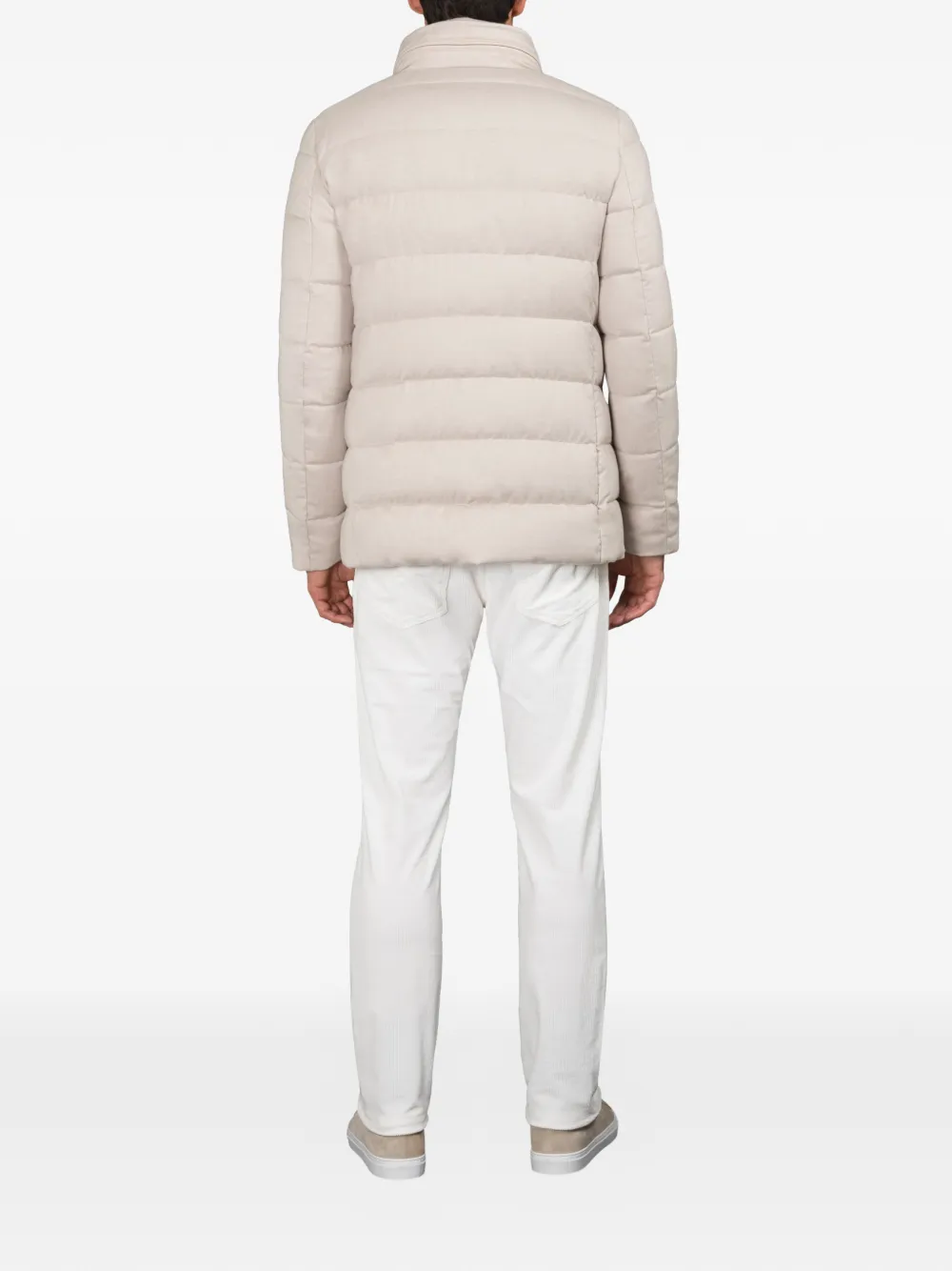 Песочно-бежевый цвет, стеганая отделка, застежка на пуговицы, высокий воротник, накладные карманы спереди, длинные рукава