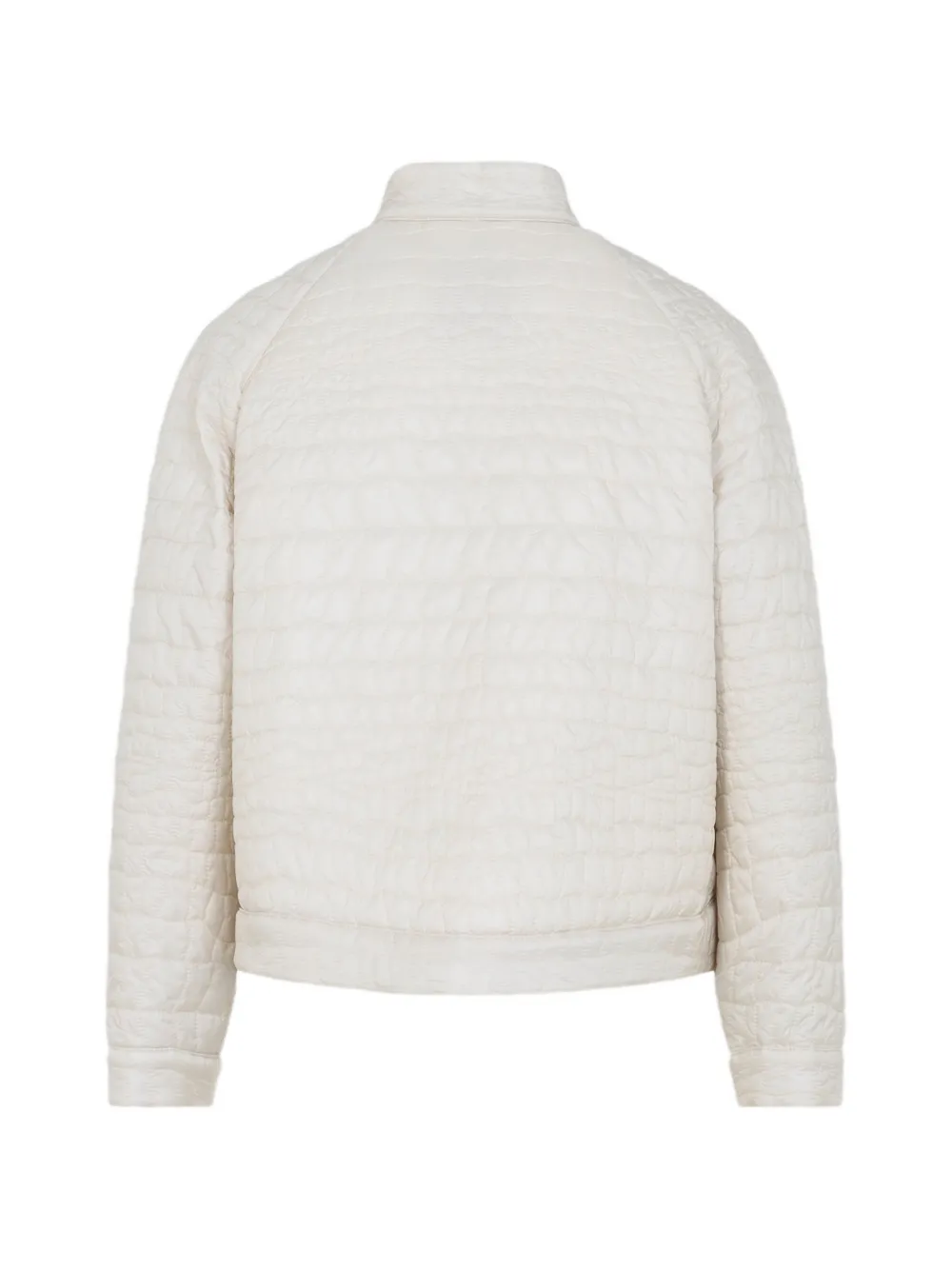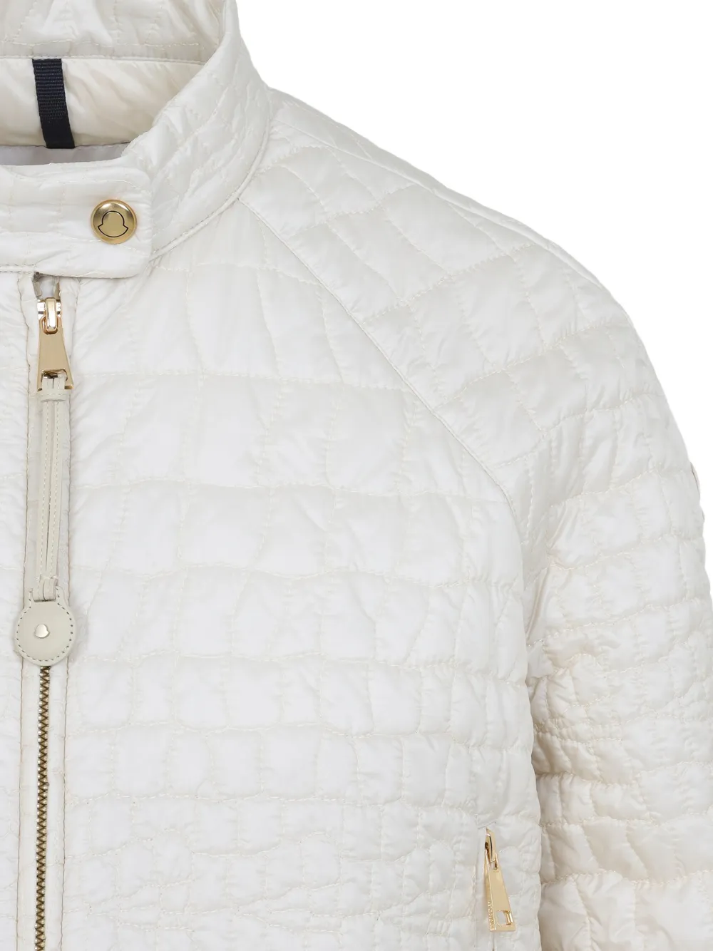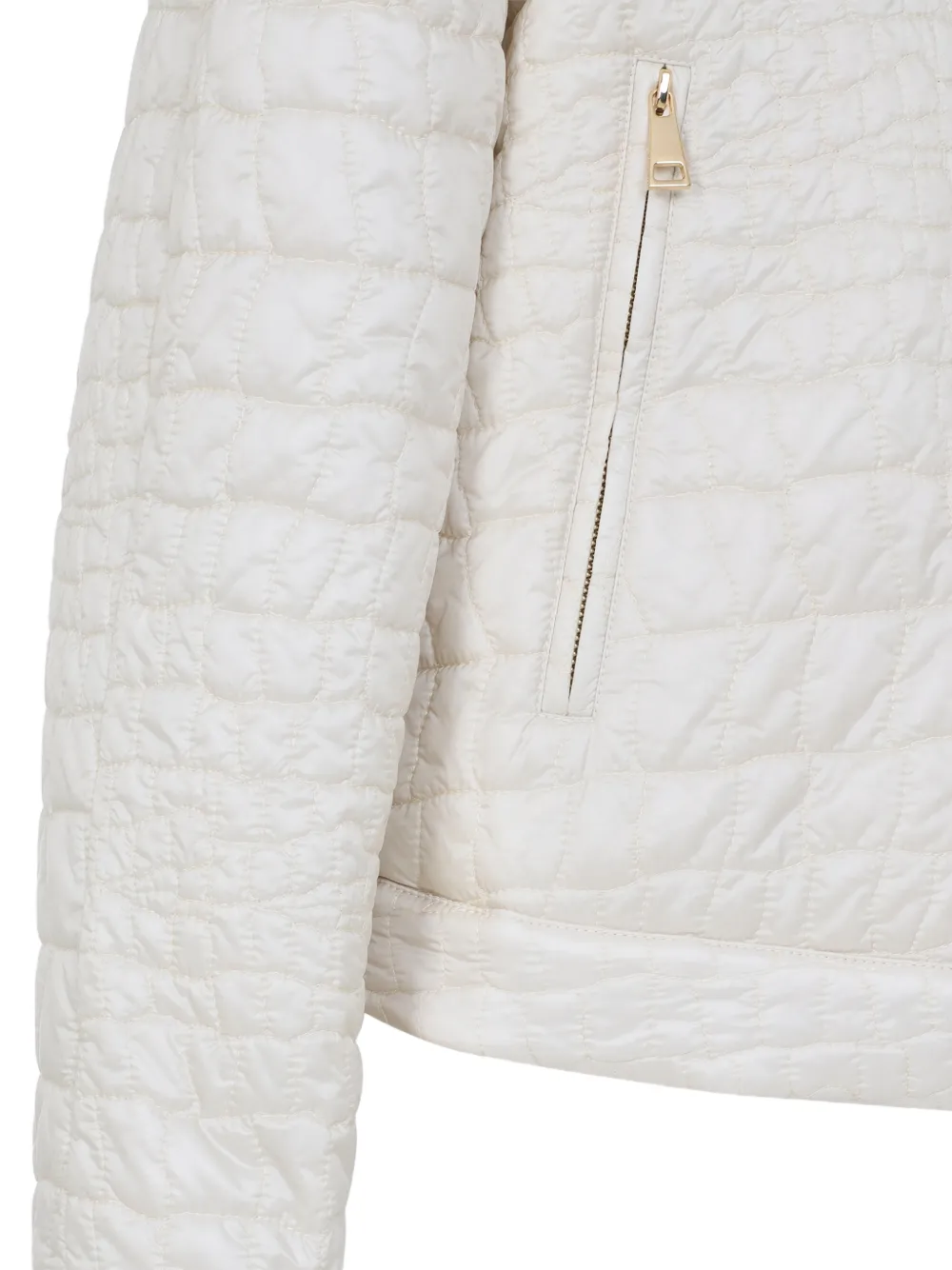 Светло-бежевый стеганый материал, застежка-молния, круглый вырез, карманы на молнии, детали на кнопках