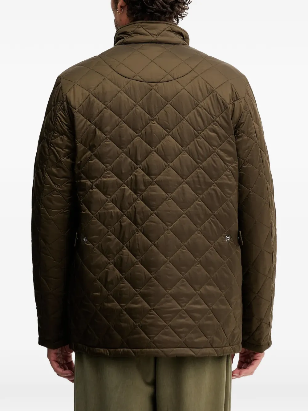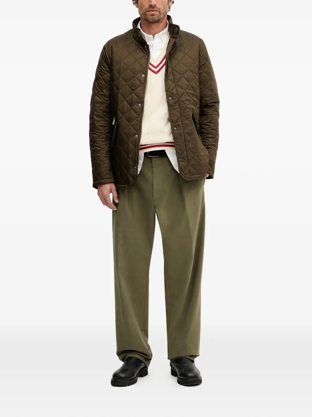 Оливковый цвет, ромбовидный узор, круглый вырез, застежка на пуговицы, накладные карманы с клапанами, карман на молнии