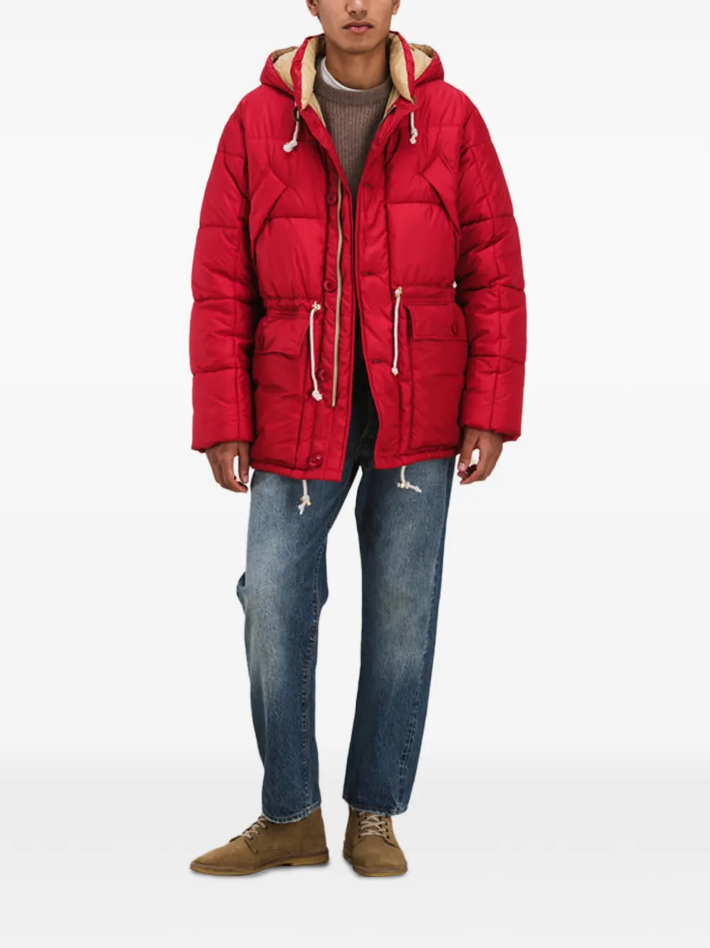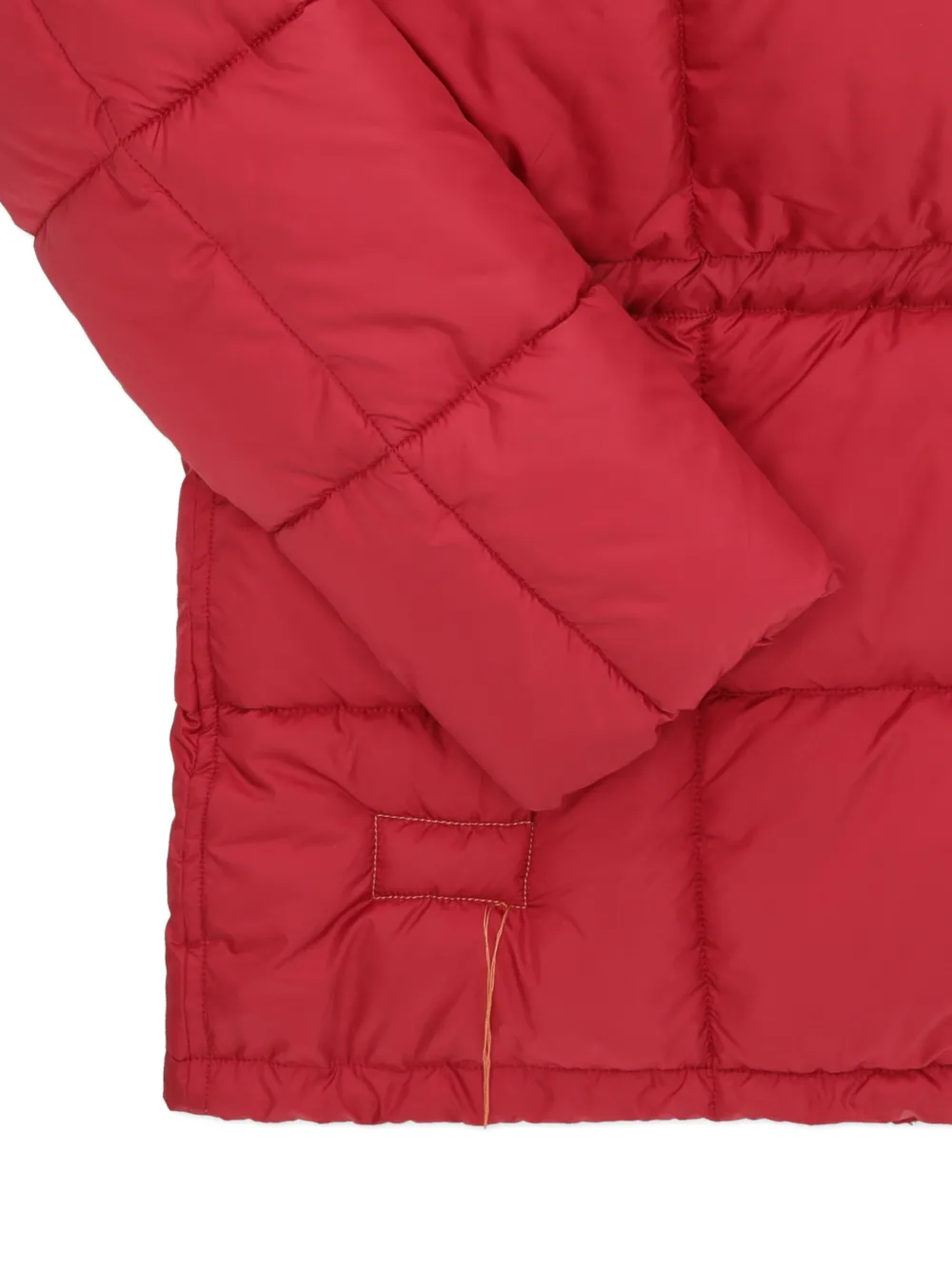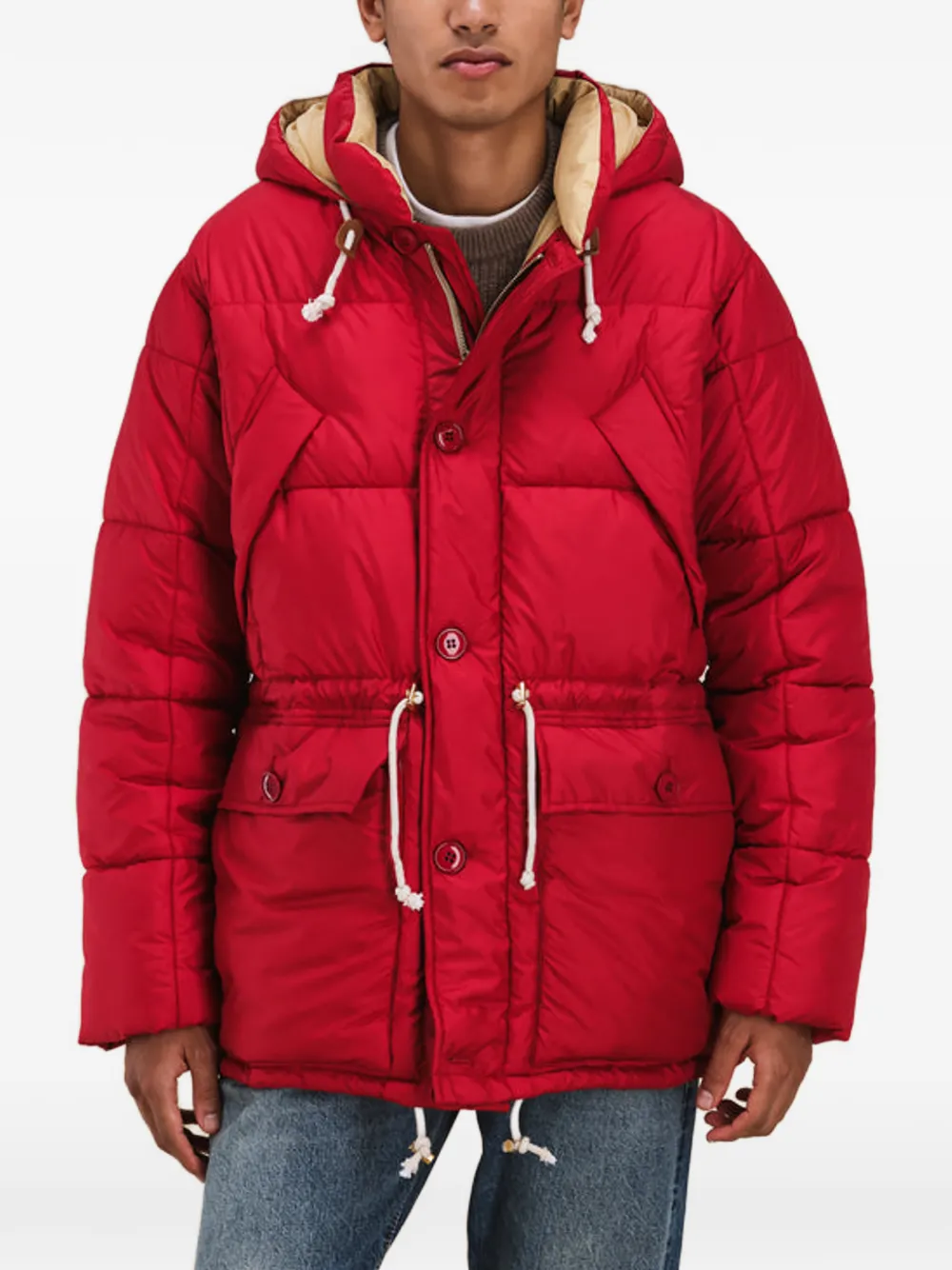 Красный стеганый дизайн, капюшон на кулиске, застежка на пуговицы, накладные карманы спереди с клапанами, кулиска на талии