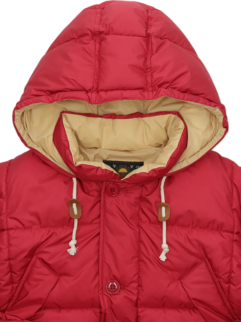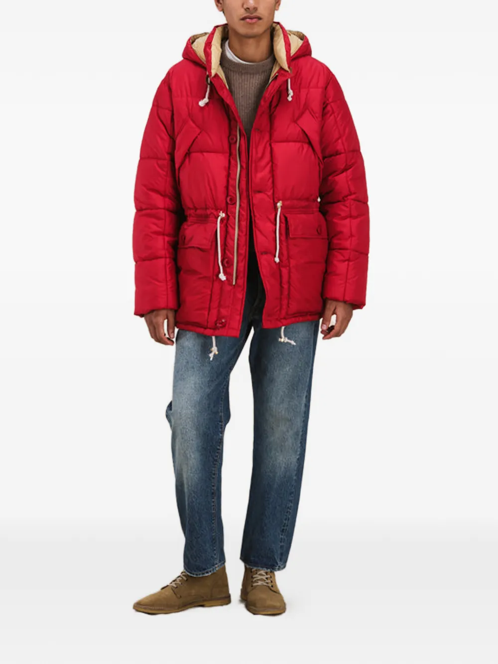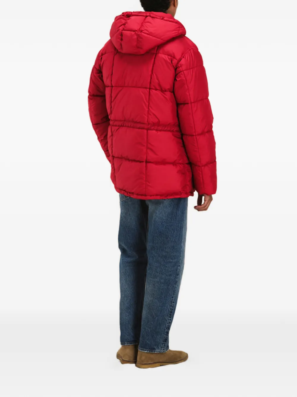 Красный стеганый дизайн, капюшон на кулиске, застежка на пуговицы, накладные карманы спереди с клапанами, кулиска на талии