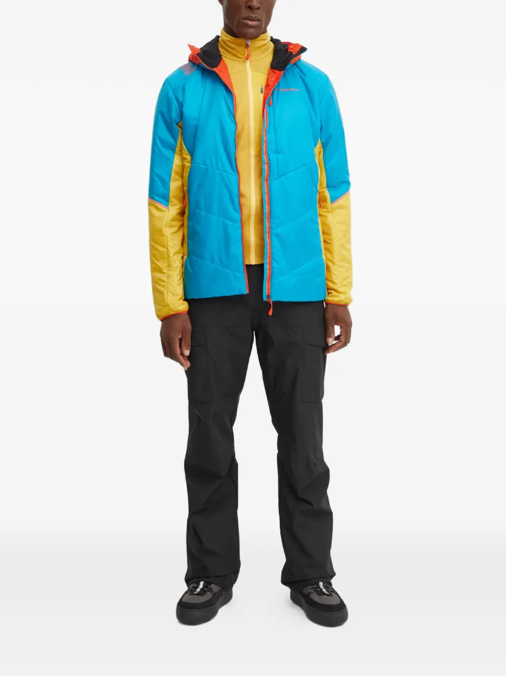 Синий и желтый стеганый дизайн, капюшон, застежка-молния спереди, карманы на молнии, детали с логотипом