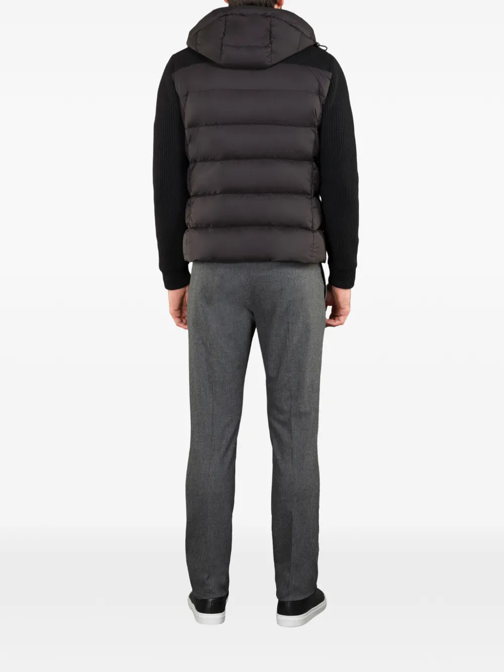 Черный цвет, воротник-стойка, застежка на молнии, несъемный капюшон, стеганый дизайн, боковые карманы на молнии, длинные рукава