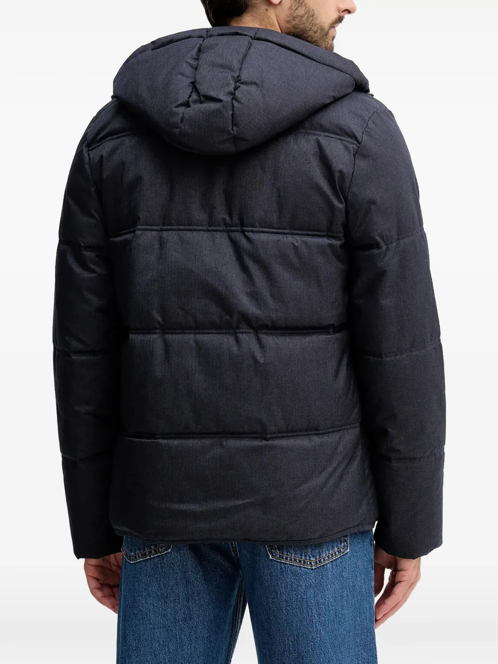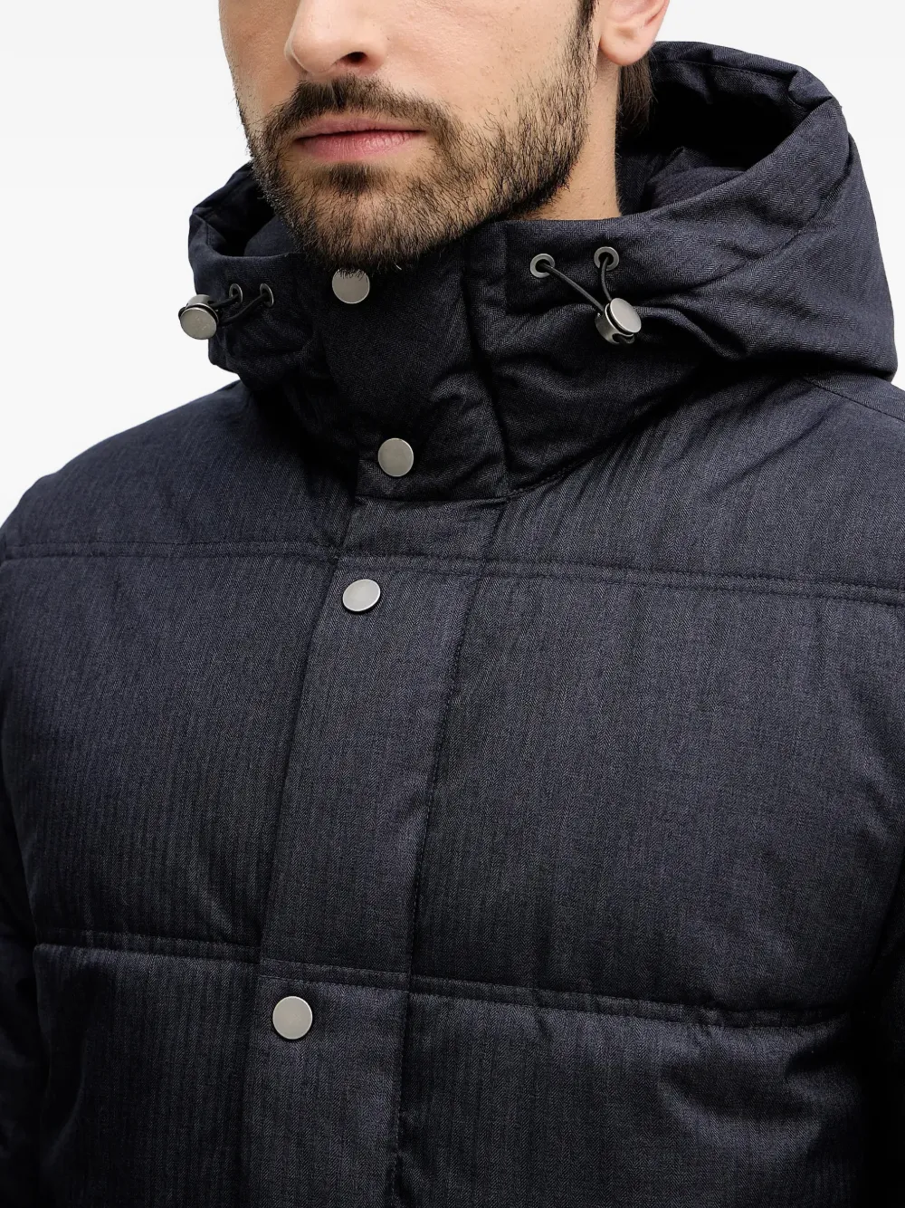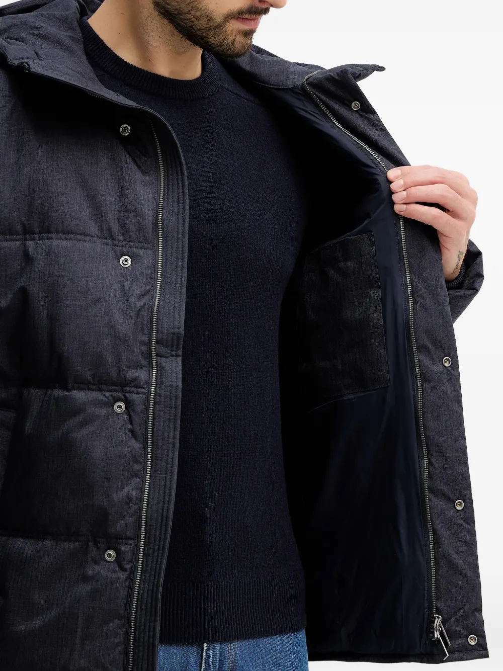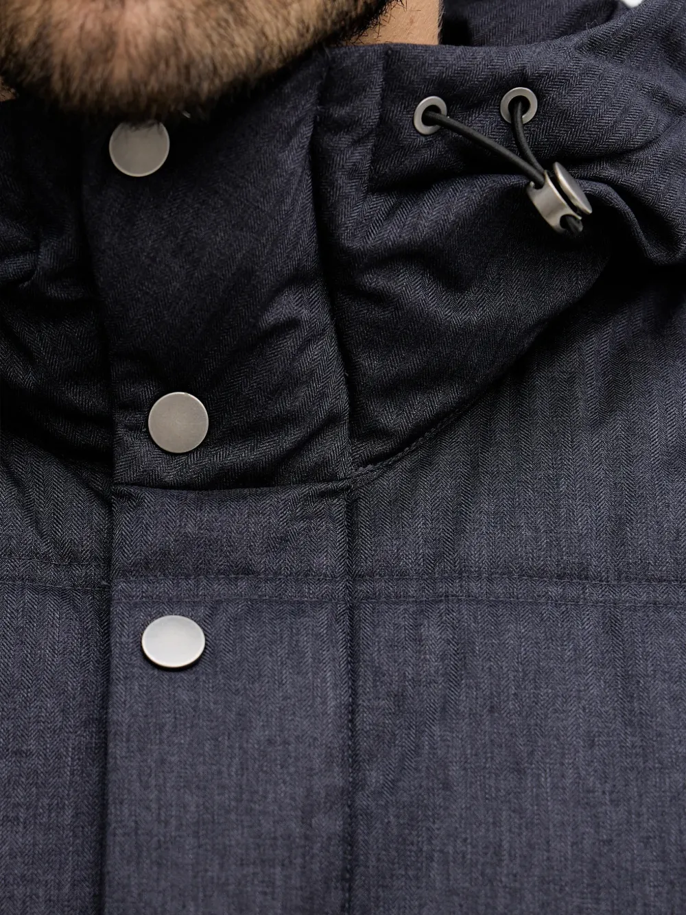 Темно-синий цвет, застежка на кнопки спереди, застежка на кнопки и молнию, капюшон со шнурком, прорезные карманы, стеганый дизайн