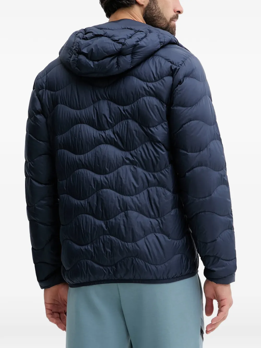 Темно-синяя стеганая куртка с капюшоном, застежкой-молнией, длинными рукавами и боковыми карманами на молнии