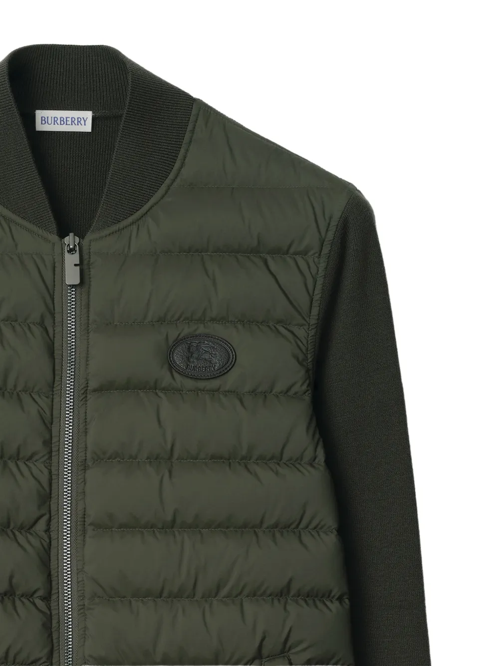 Сланцево-зеленый цвет, стеганый дизайн, рукава из шерстяных вставок, застежка-молния спереди, нашивка с логотипом, боковые карманы на молнии