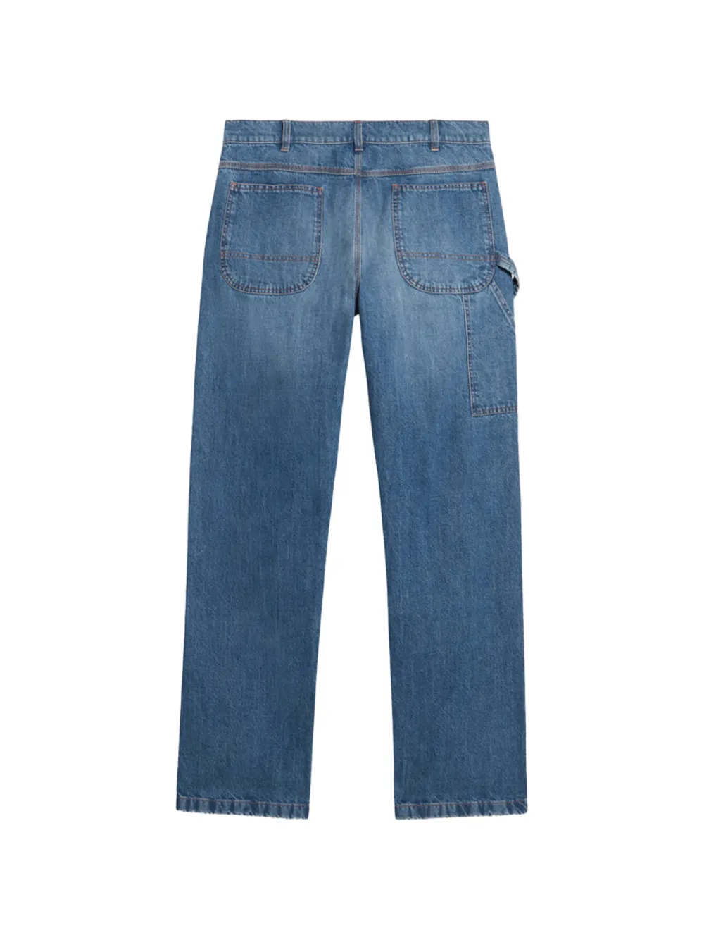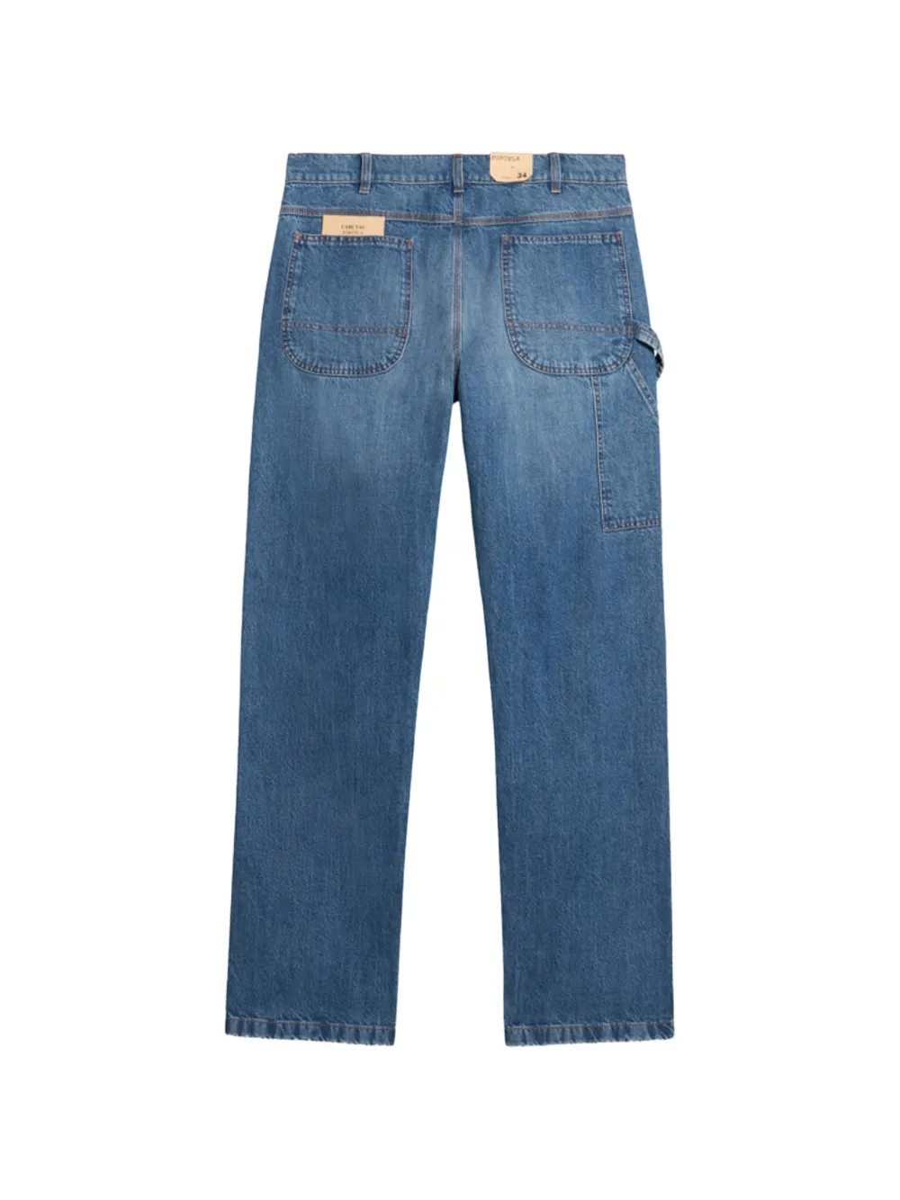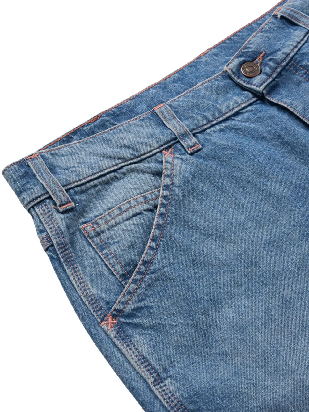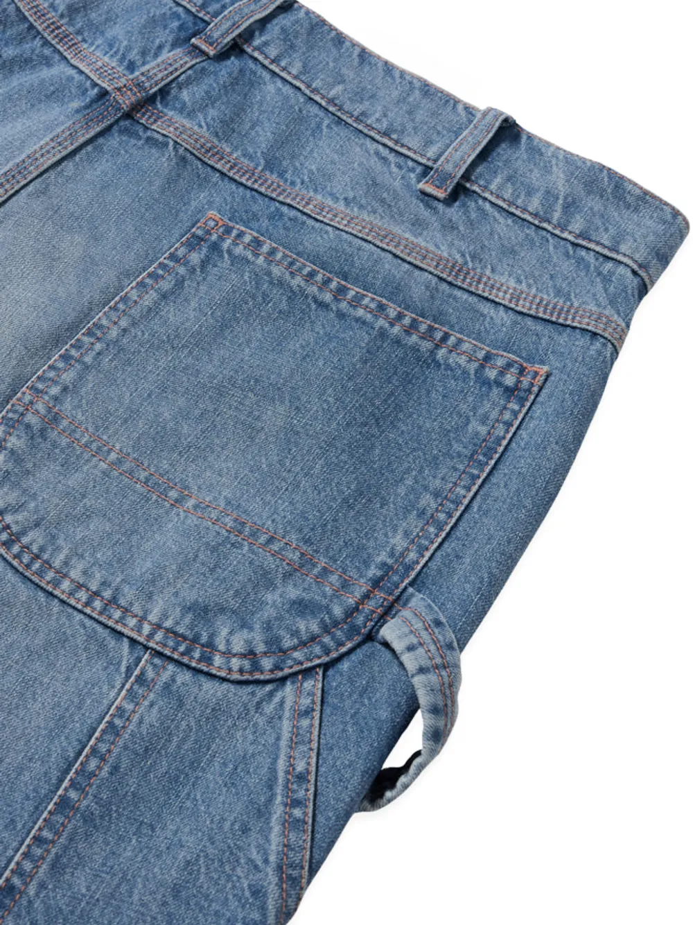 Синие накладные карманы, шлевки для пояса, застежка на пуговицы