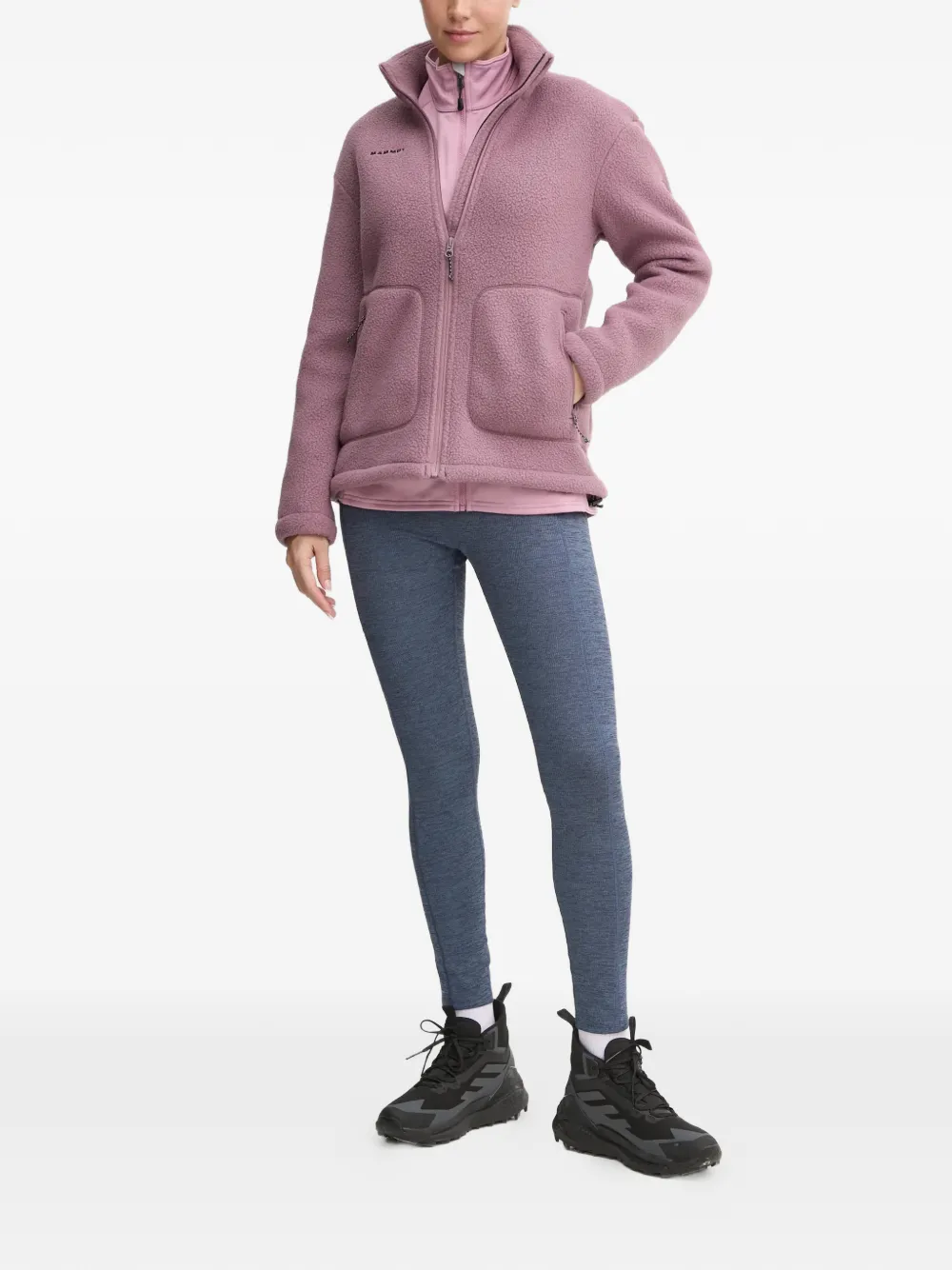 Светло-розовая куртка с застежкой на молнию, высоким воротником, логотипом и контрастными вставками, длинные рукава