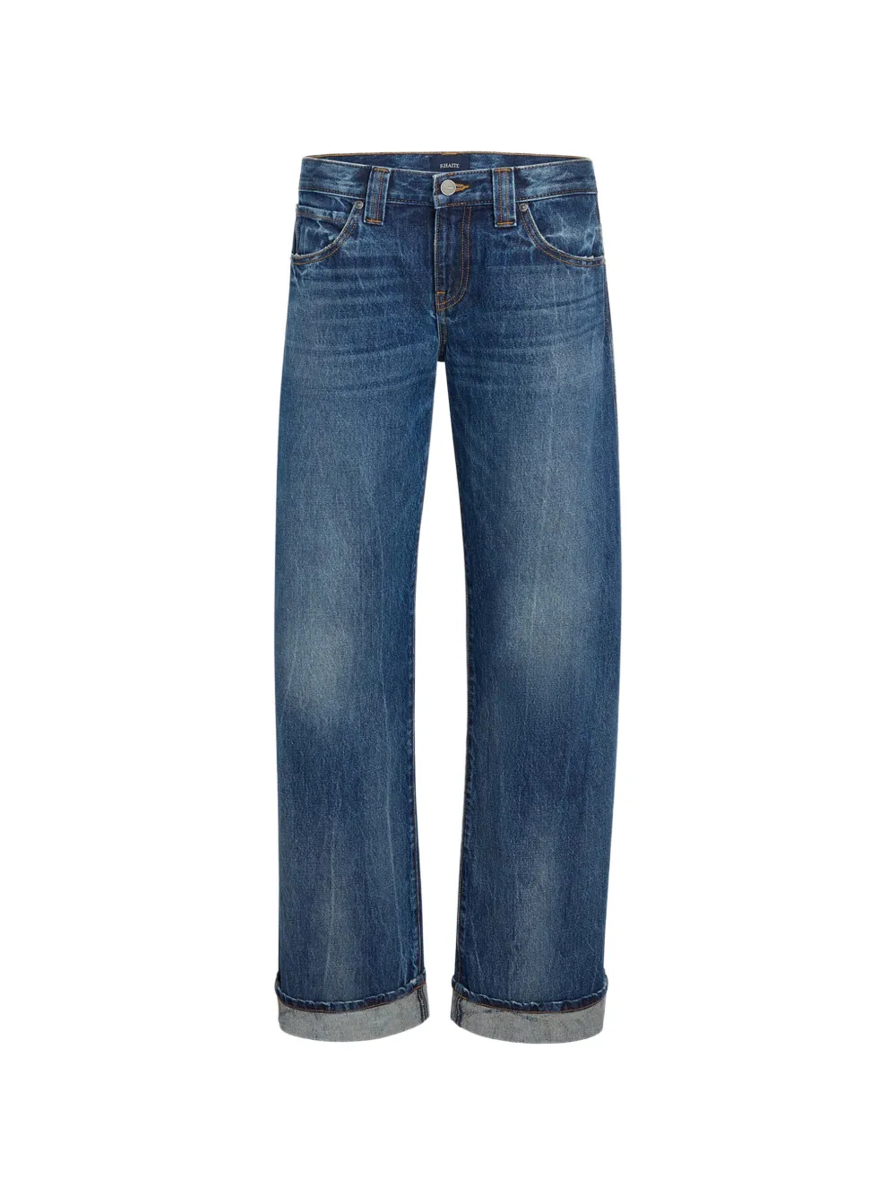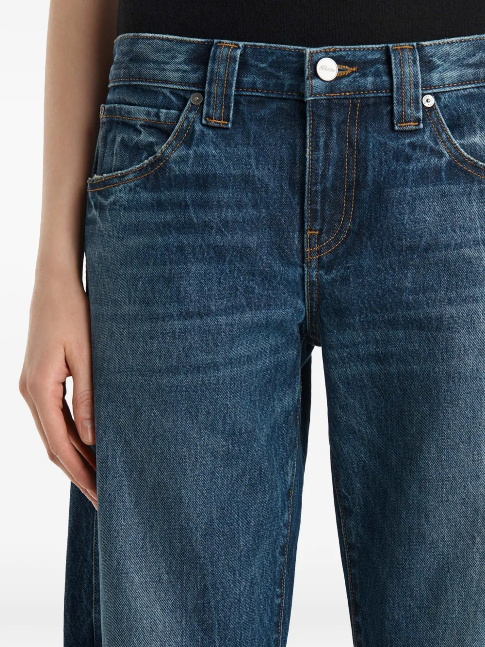 Темно-синий цвет, манжеты на брючинах, пять карманов, отстрочка, заниженная талия