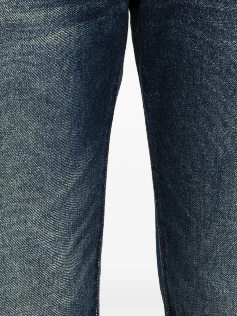 Синий деним, застежка на пуговицы, шлевки для ремня, пять карманов, подвернутый край