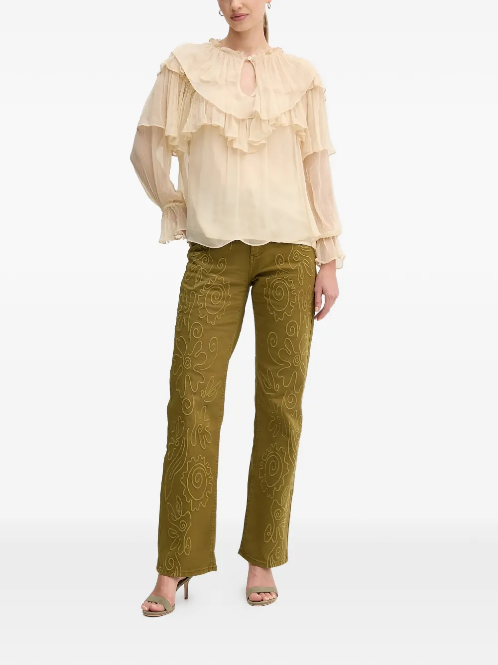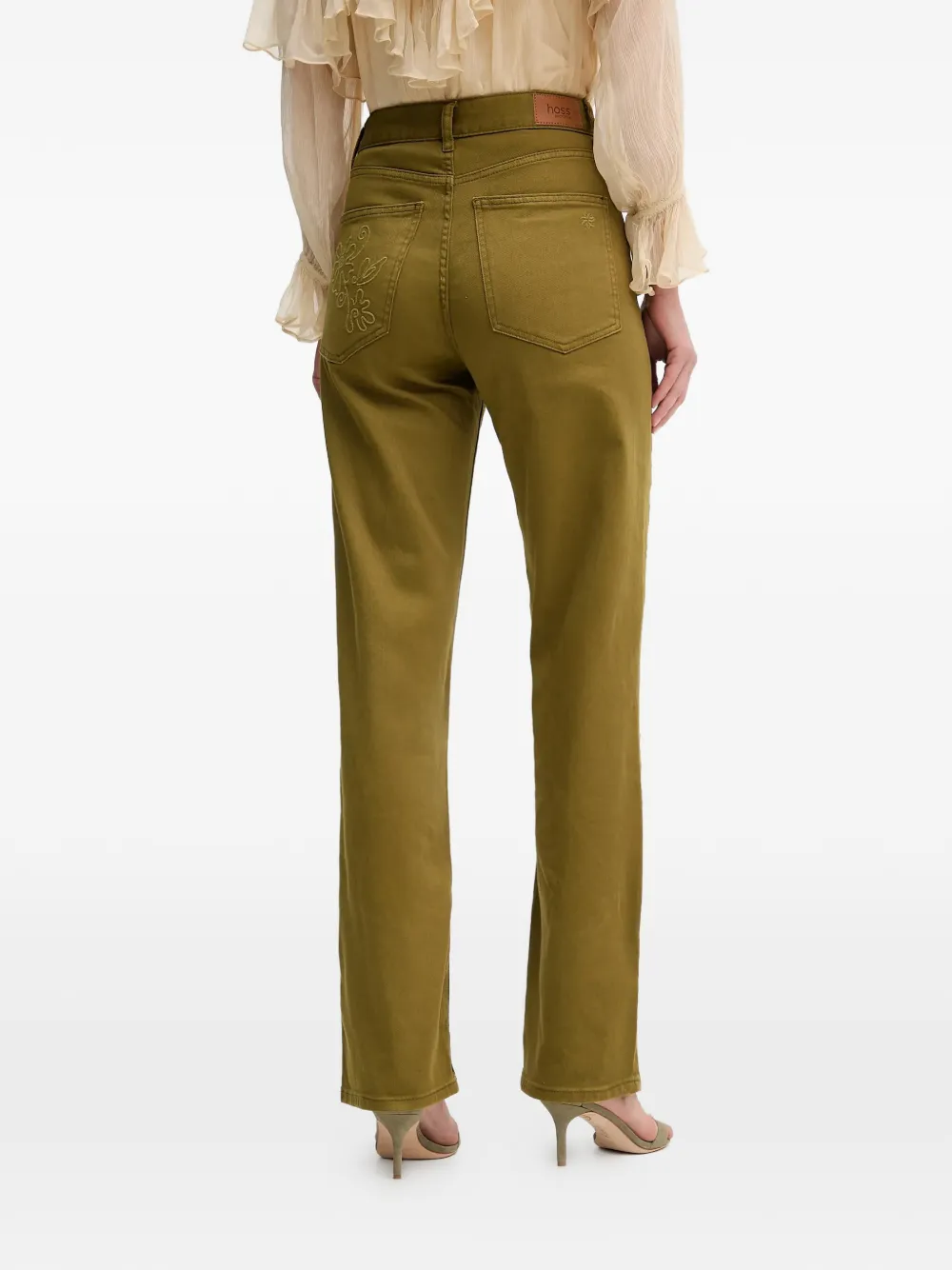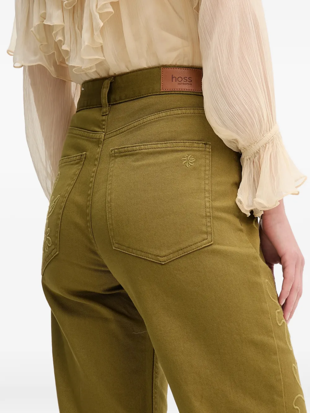 Оливково-зеленый, цветочная вышивка на спине, накладной карман, шлевки для ремня, пять карманов