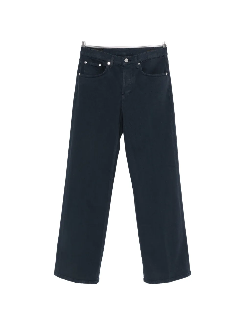 Синий цвет, пятикарманный стиль, застежка на пуговицах, заклепки серебристого оттенка, тональная отделочная строчка, прямой крой брючин