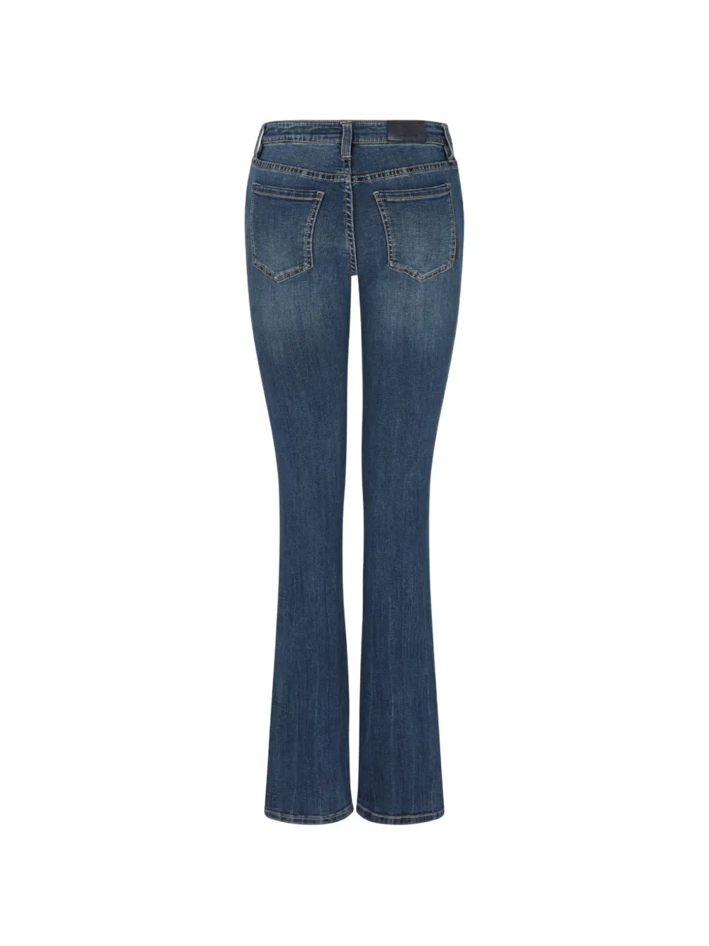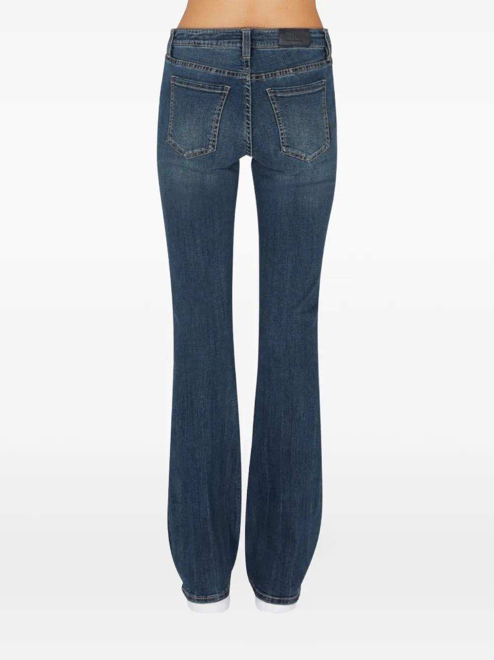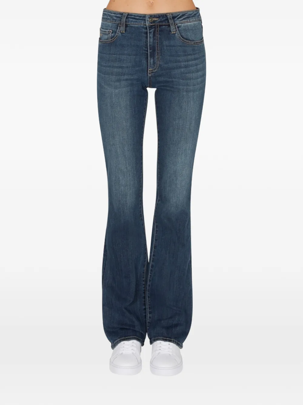Синие шлевки для ремня, пять карманов, расклешенный низ