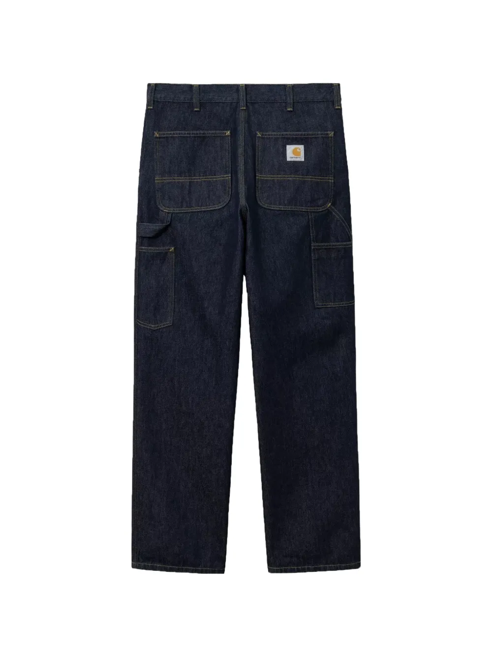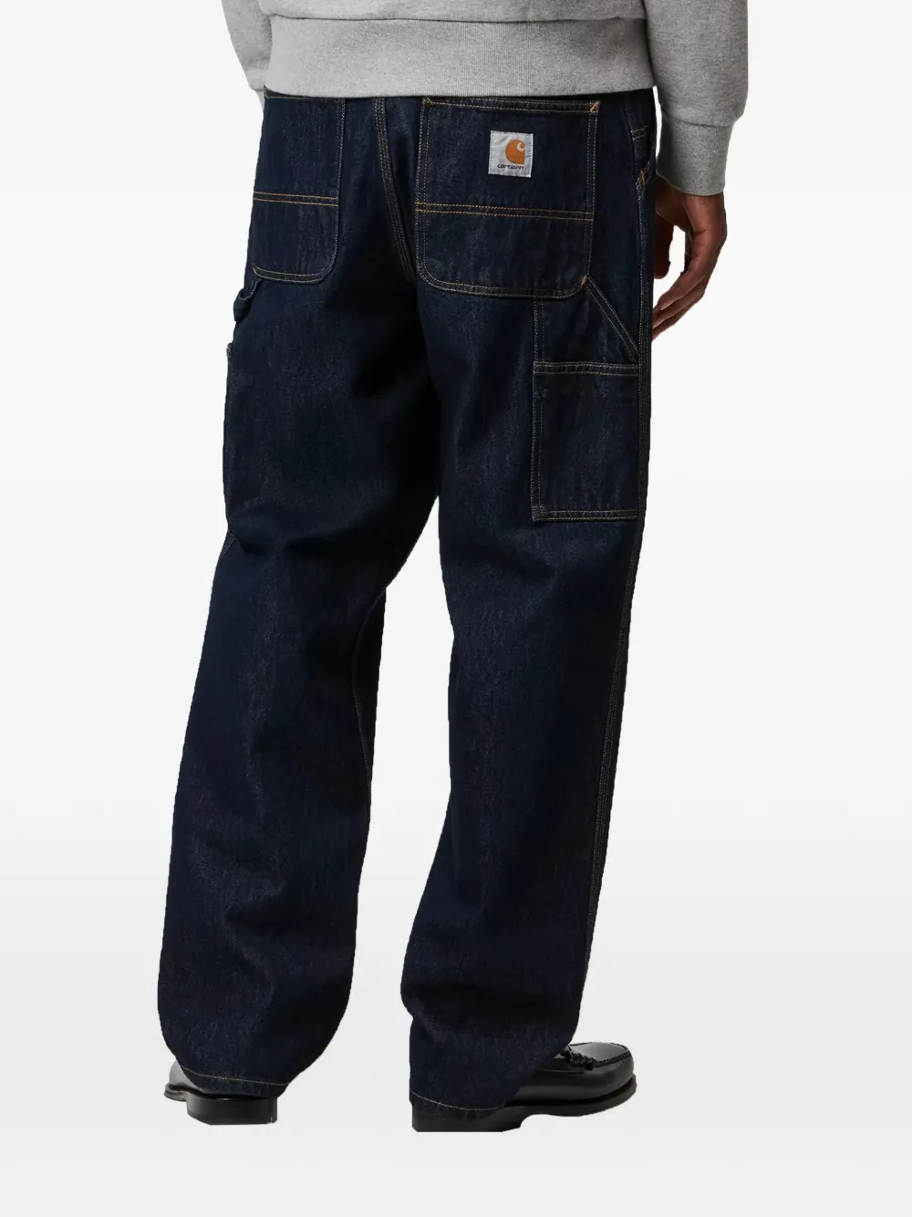 Синие накладные карманы, шлевки для ремня, прямые брючины