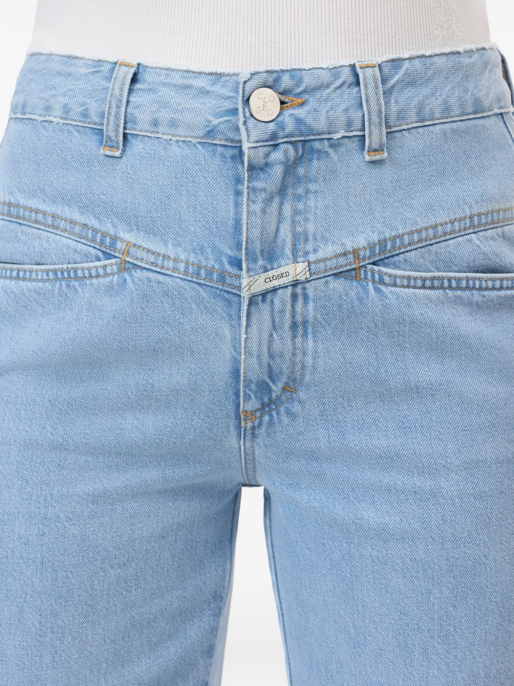 Светло-голубой цвет, детали со швами, нашивка сзади, застежка на пуговицу, шлевки для ремня, пять карманов