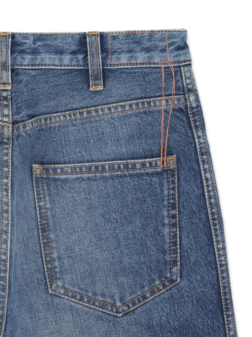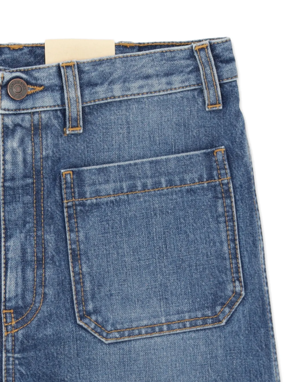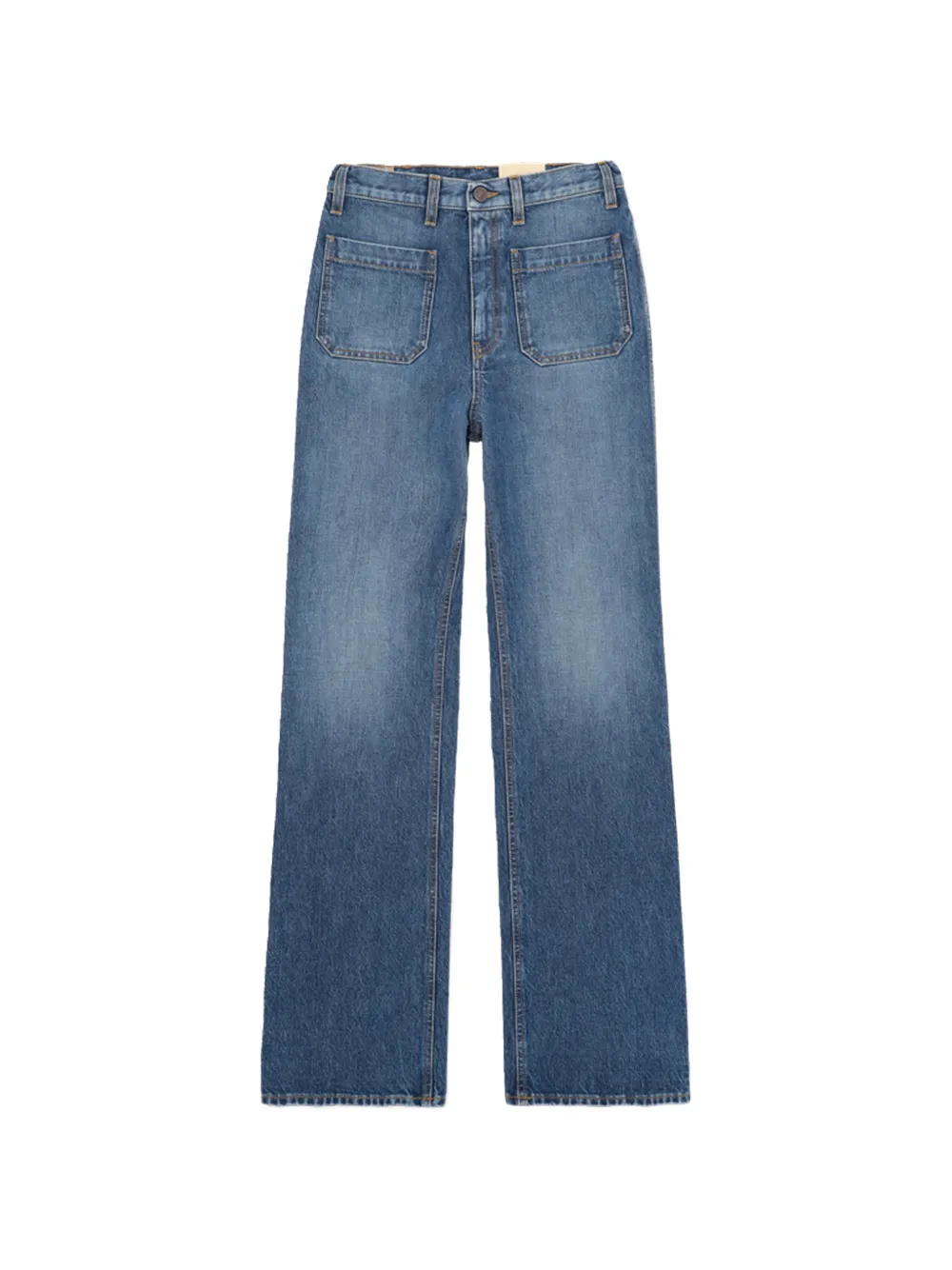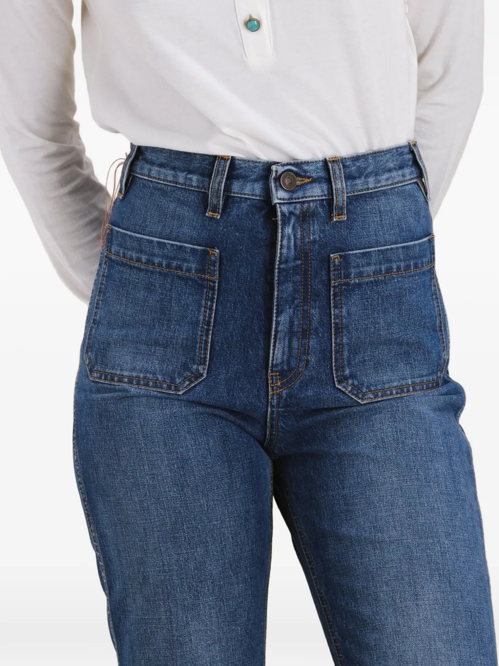 Индиго-синие брюки с накладными карманами, расклешенным низом, высокой талией, шлевками для ремня и застежкой на пуговицу