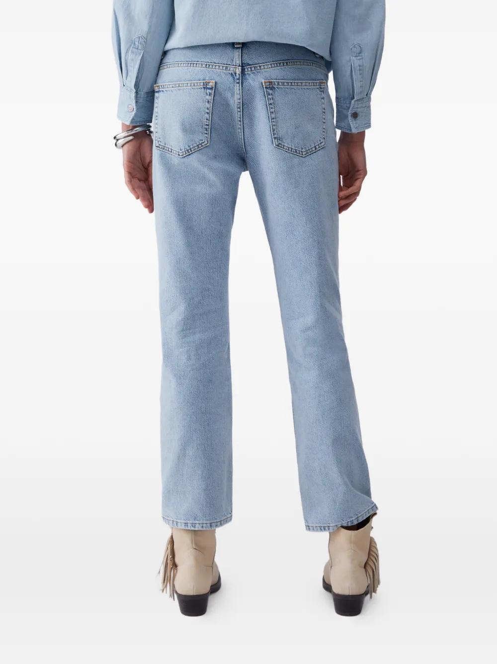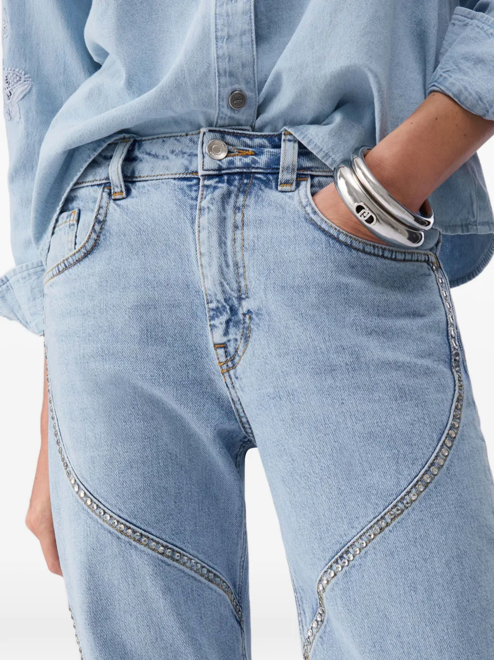 Светло-голубой цвет, контрастная строчка, средняя посадка, застежка спереди на пуговицу и молнию, шлевки для ремня
