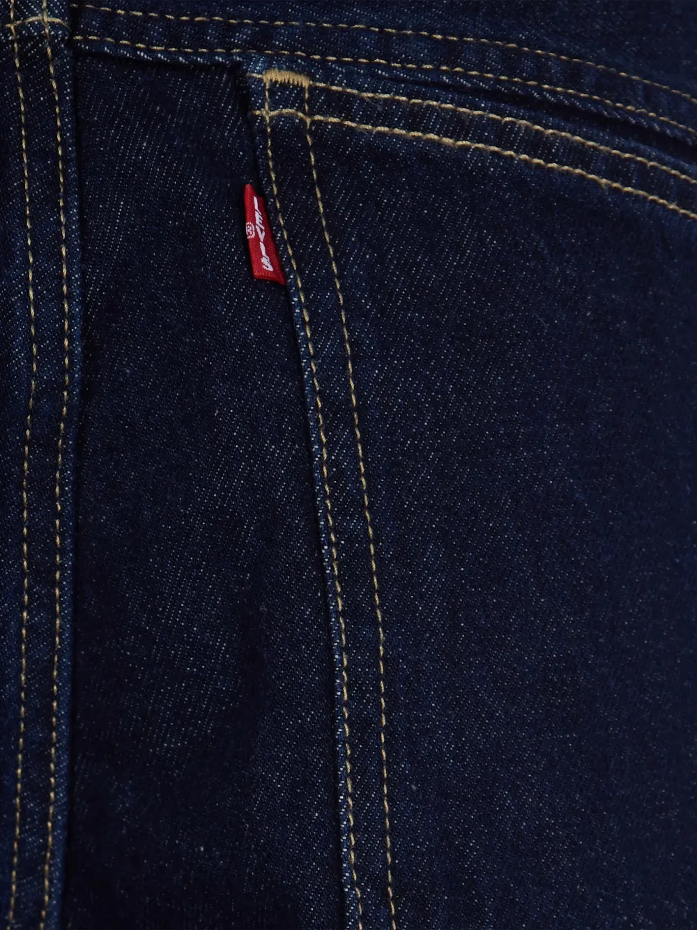 Темно-индиго синие джинсы с контрастной прострочкой, застежкой на пуговицах, шлевками для ремня, классическими пятью карманами и фасоном «баррель»