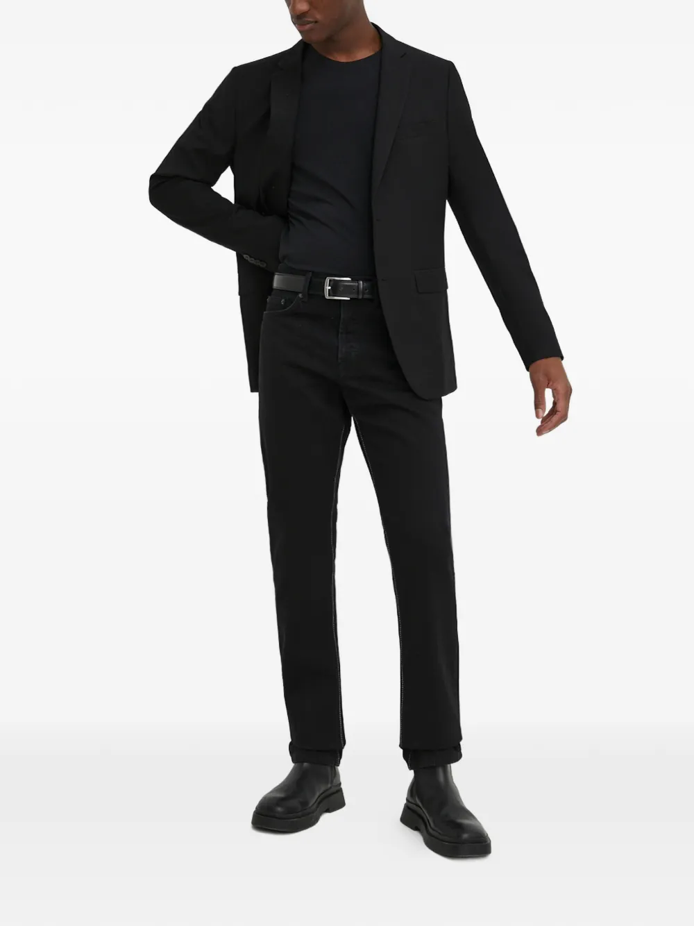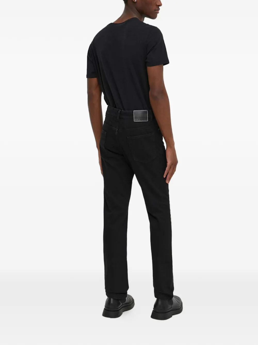 Черные с простроченными деталями, шлевки для ремня, пять карманов, застежка на пуговицу, нашивка с логотипом сзади