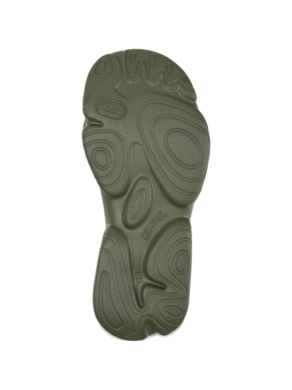 Коричневая и зеленая ребристая резиновая подошва, застежка на липучке, открытый носок