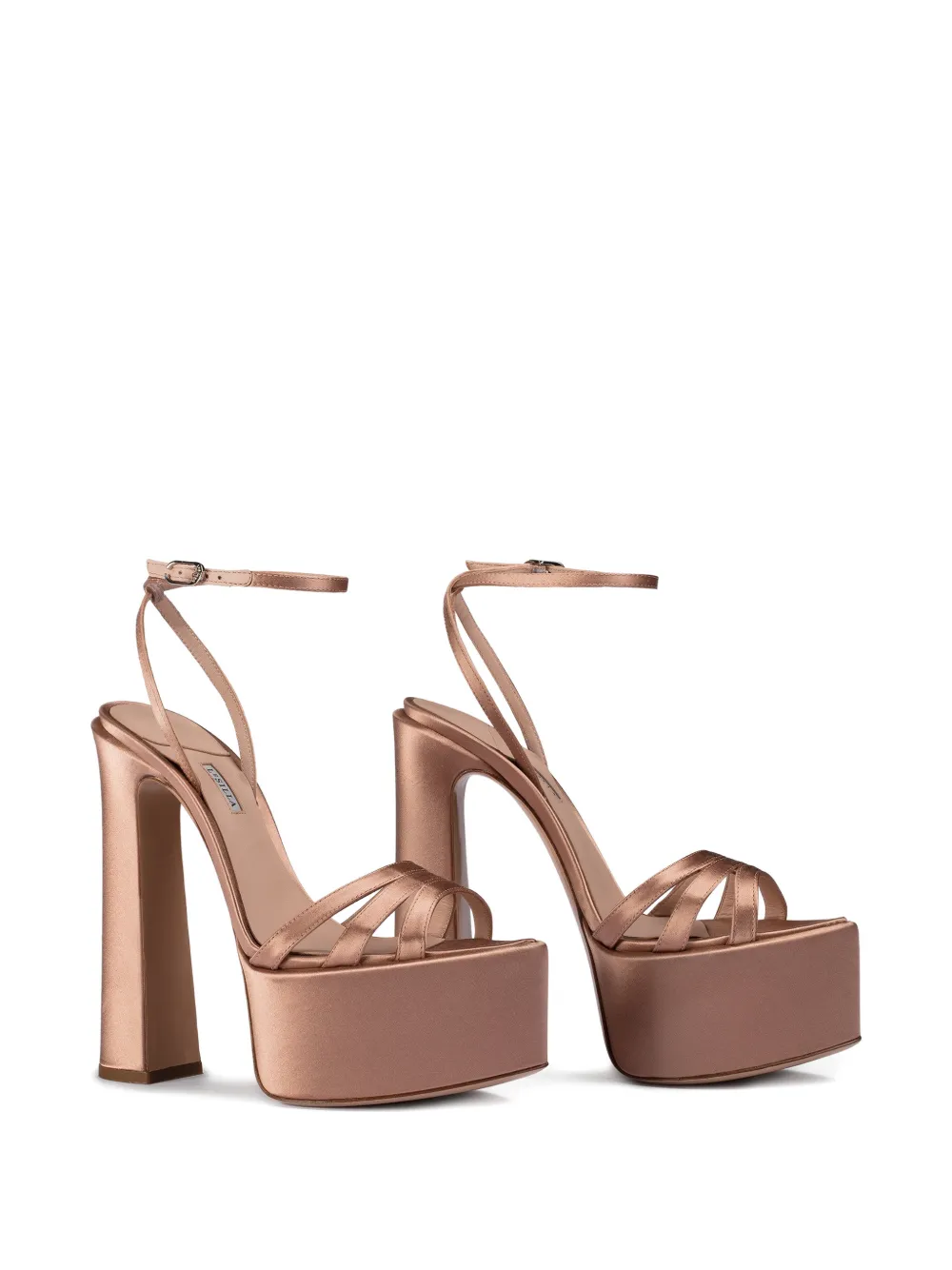 Светло-коричневые босоножки из сатина с несколькими ремешками, каблук 170 мм, платформой и застежкой-пряжкой на щиколотке