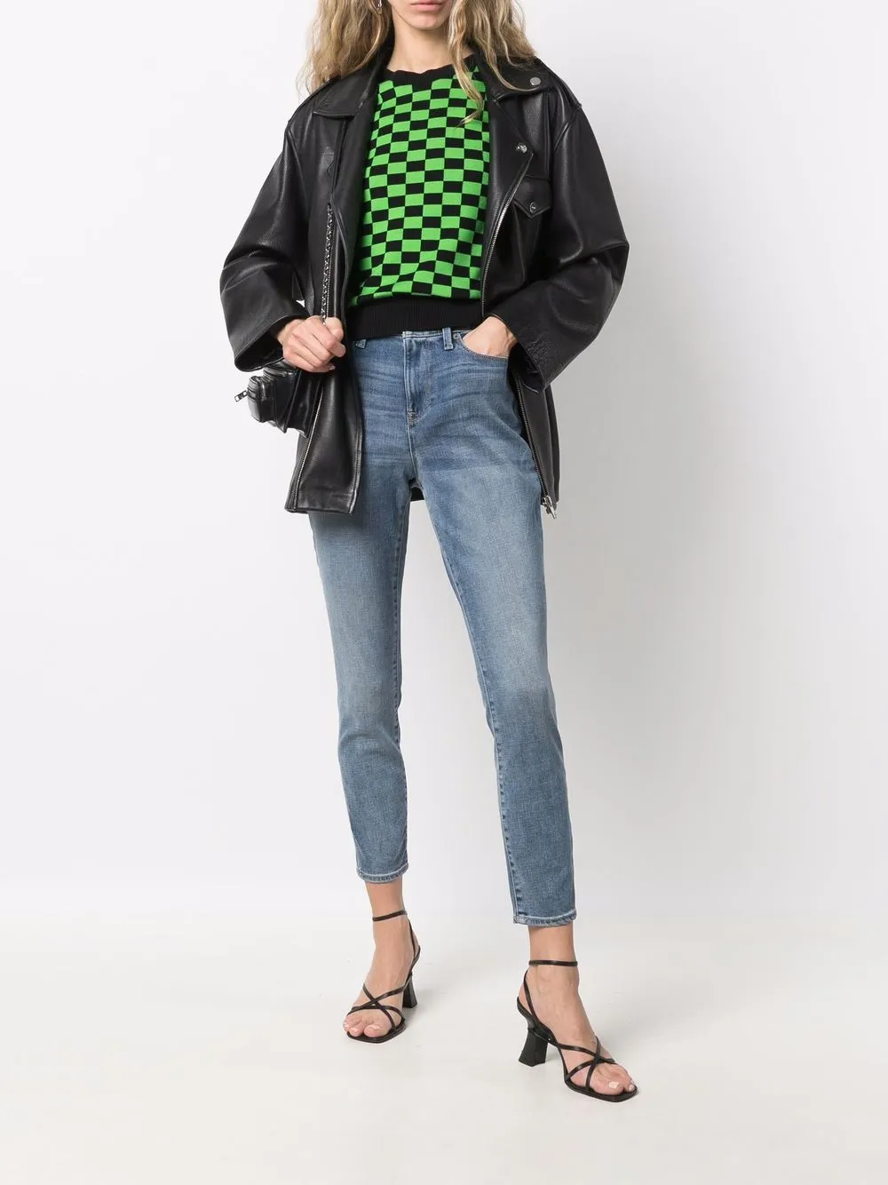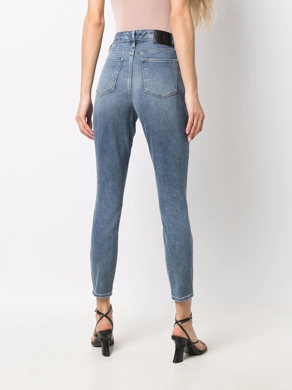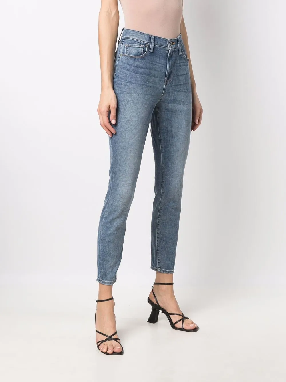 Обработанный деним, нашивка с логотипом сзади, облегающий крой, завышенная талия, укороченная длина, классическая пятикарманная модель, потайная застежка на молнии и пуговицах и петли для ремня.