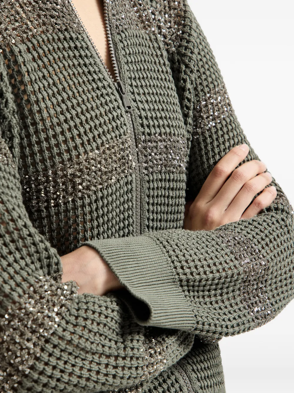 Зеленый, с ребристыми манжетами и подолом, застежка-молния