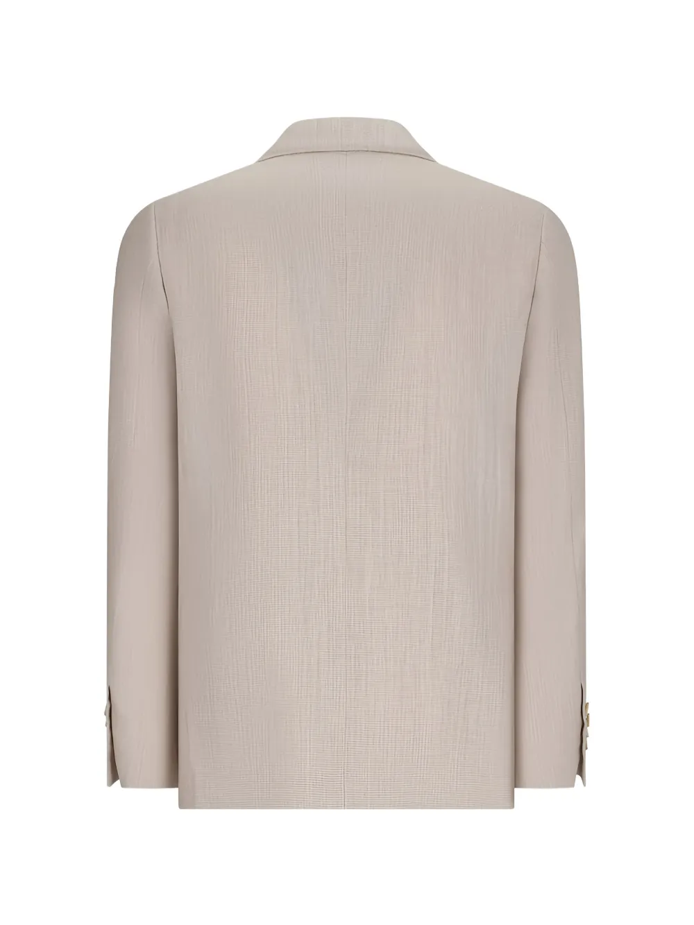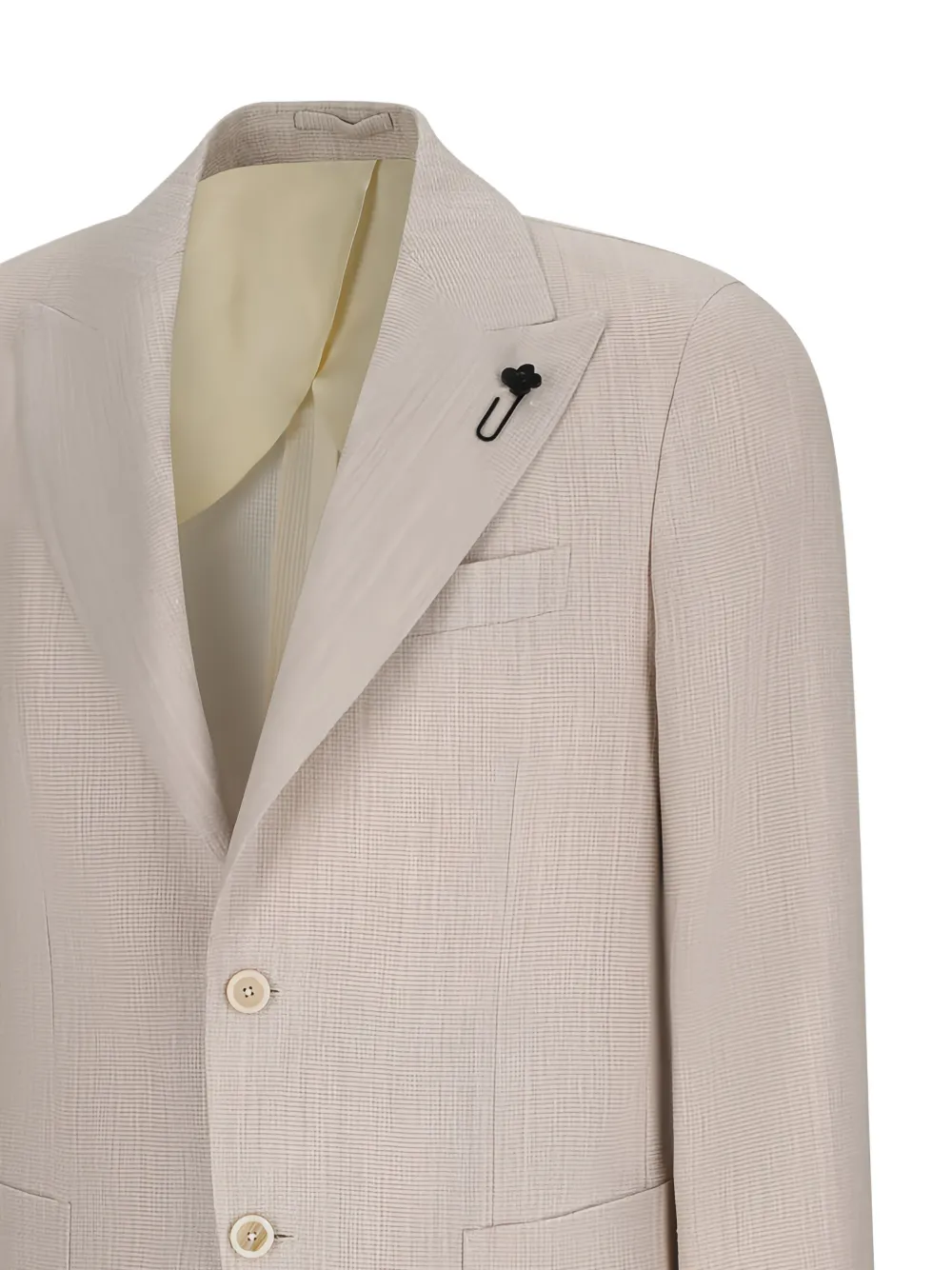 Светло-бежевый пиджак с лацканами, двумя накладными карманами спереди, застежкой на пуговицы, манжетами на пуговицах и декоративной булавкой