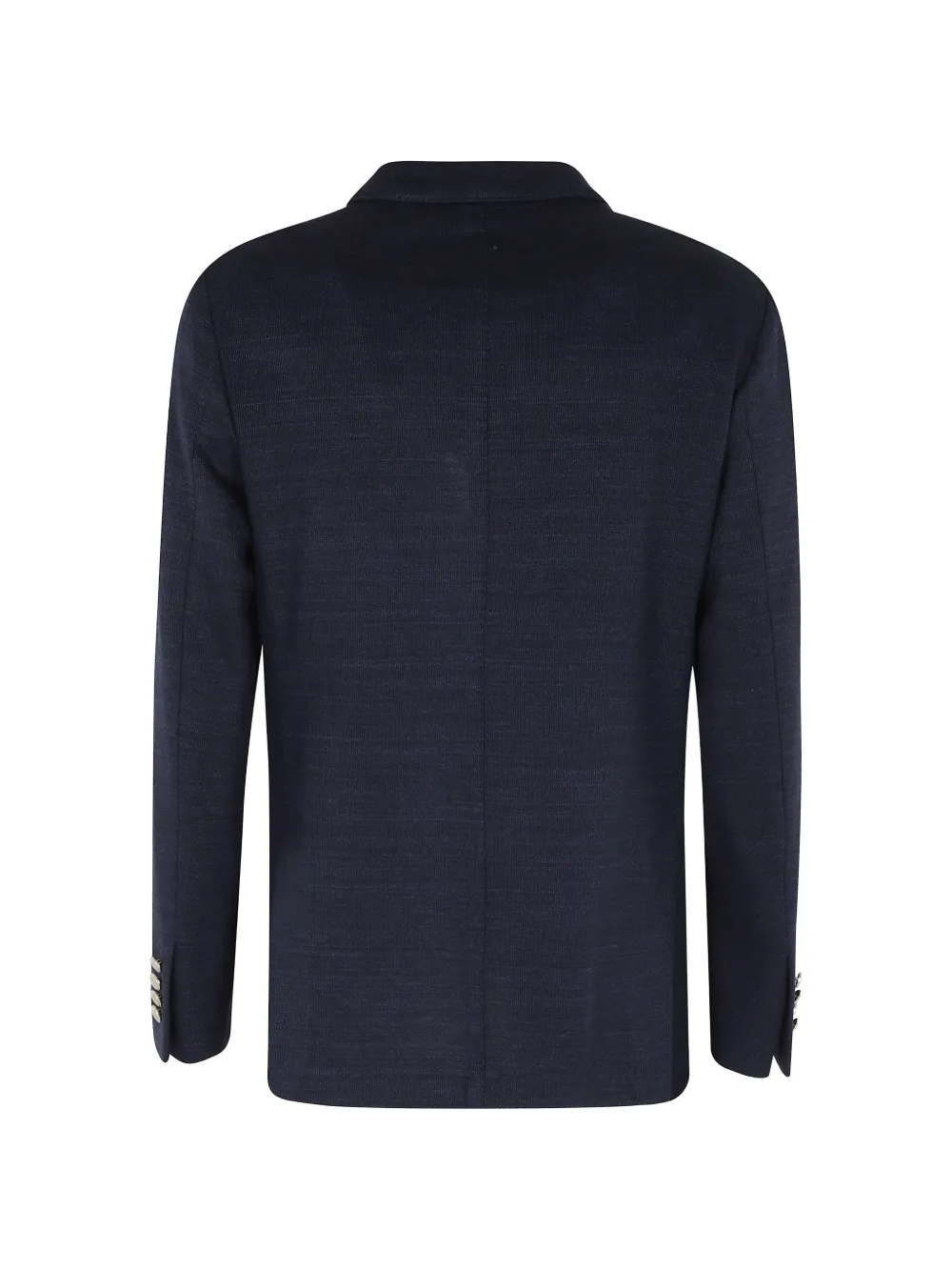 Синие пуговицы на рукавах, застежка на двубортных пуговицах, накладные карманы