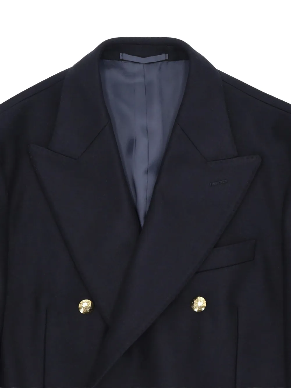 Синий цвет, нагрудный прорезной карман, передние клапанные карманы, двубортная застежка на пуговицы