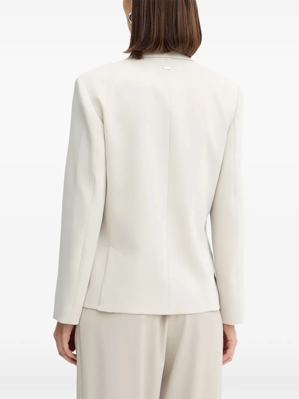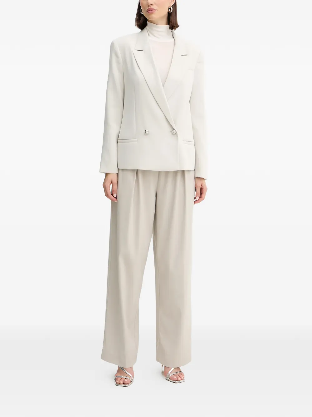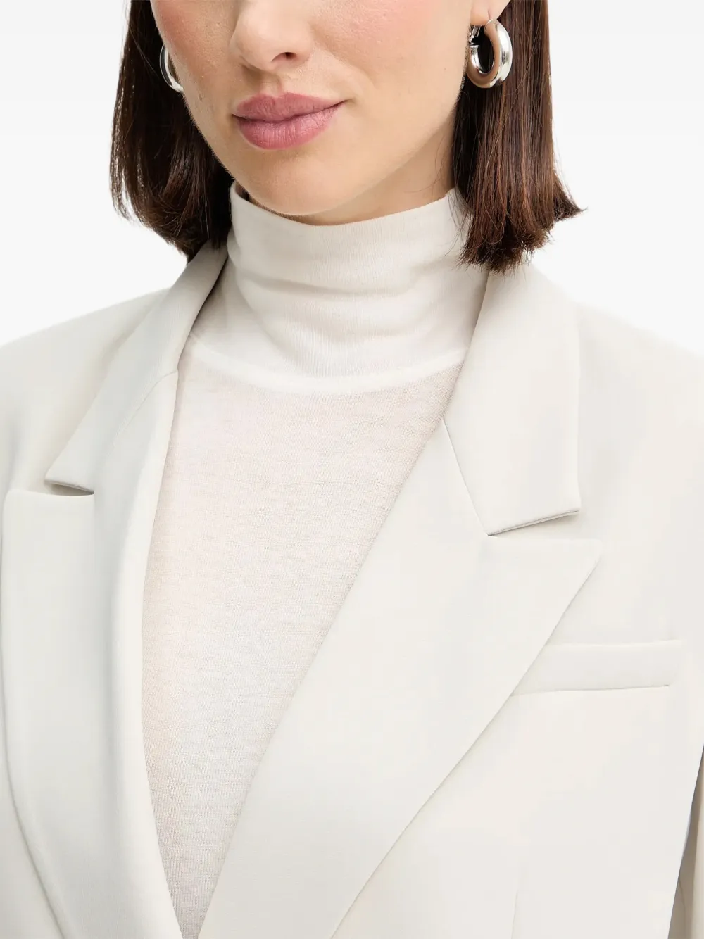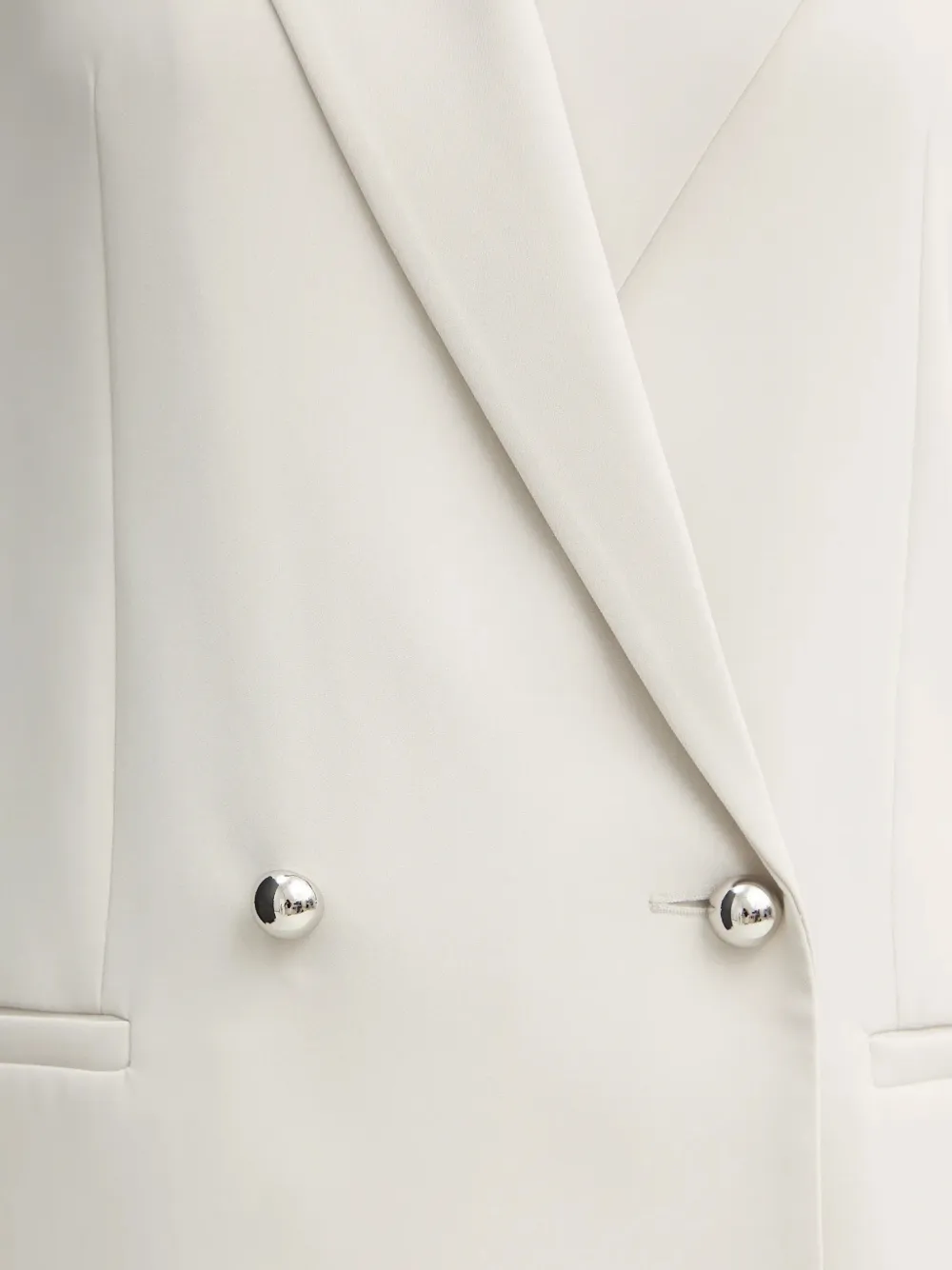 Белый двубортный пиджак, пуговицы серебристого оттенка, лацканы с выемкой, прорезные карманы с клапанами, подплечники