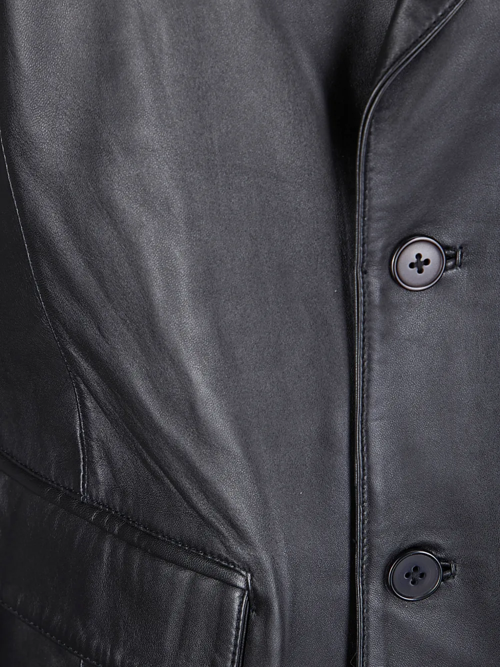 Черный цвет, боковые карманы с клапанами, приталенный крой, застежка на пуговицы спереди, отделка швами