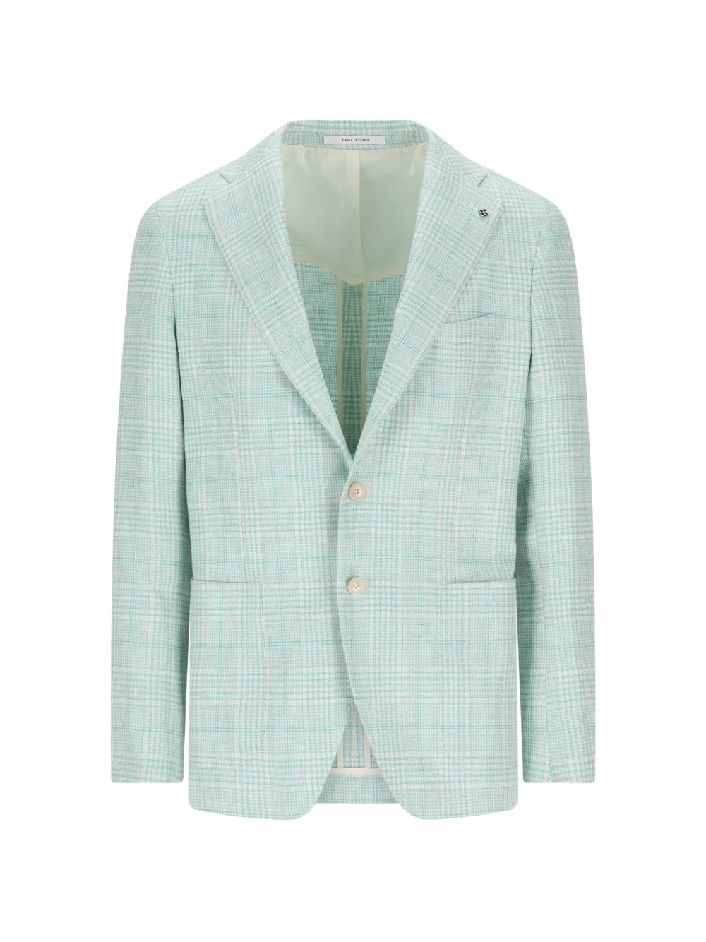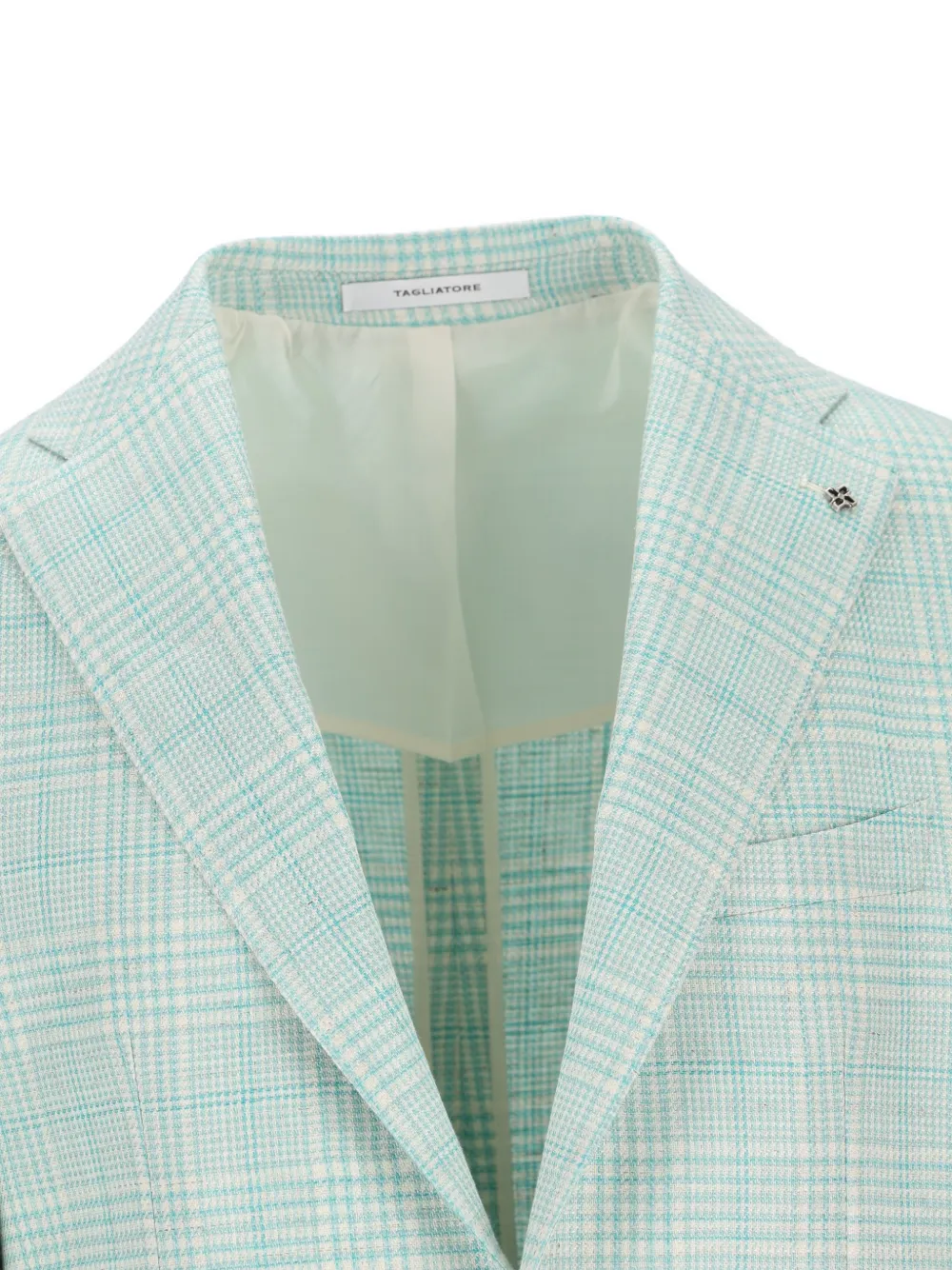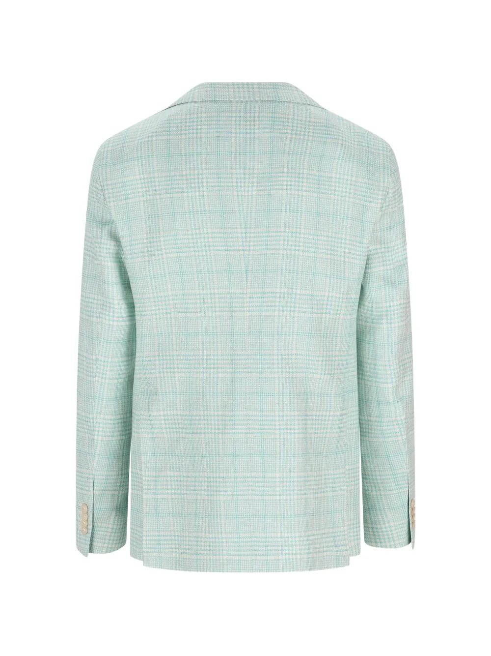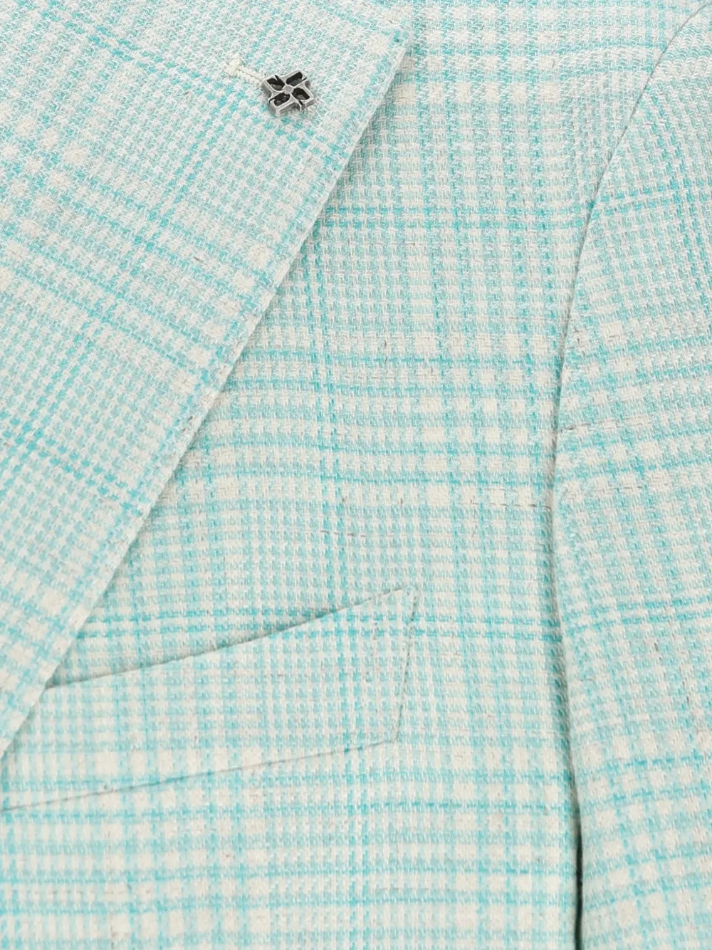 Булавка на лацкане с узором в клетку светло-бирюзового цвета, нагрудный прорезной карман, застежка на пуговицы, передние карманы с клапанами