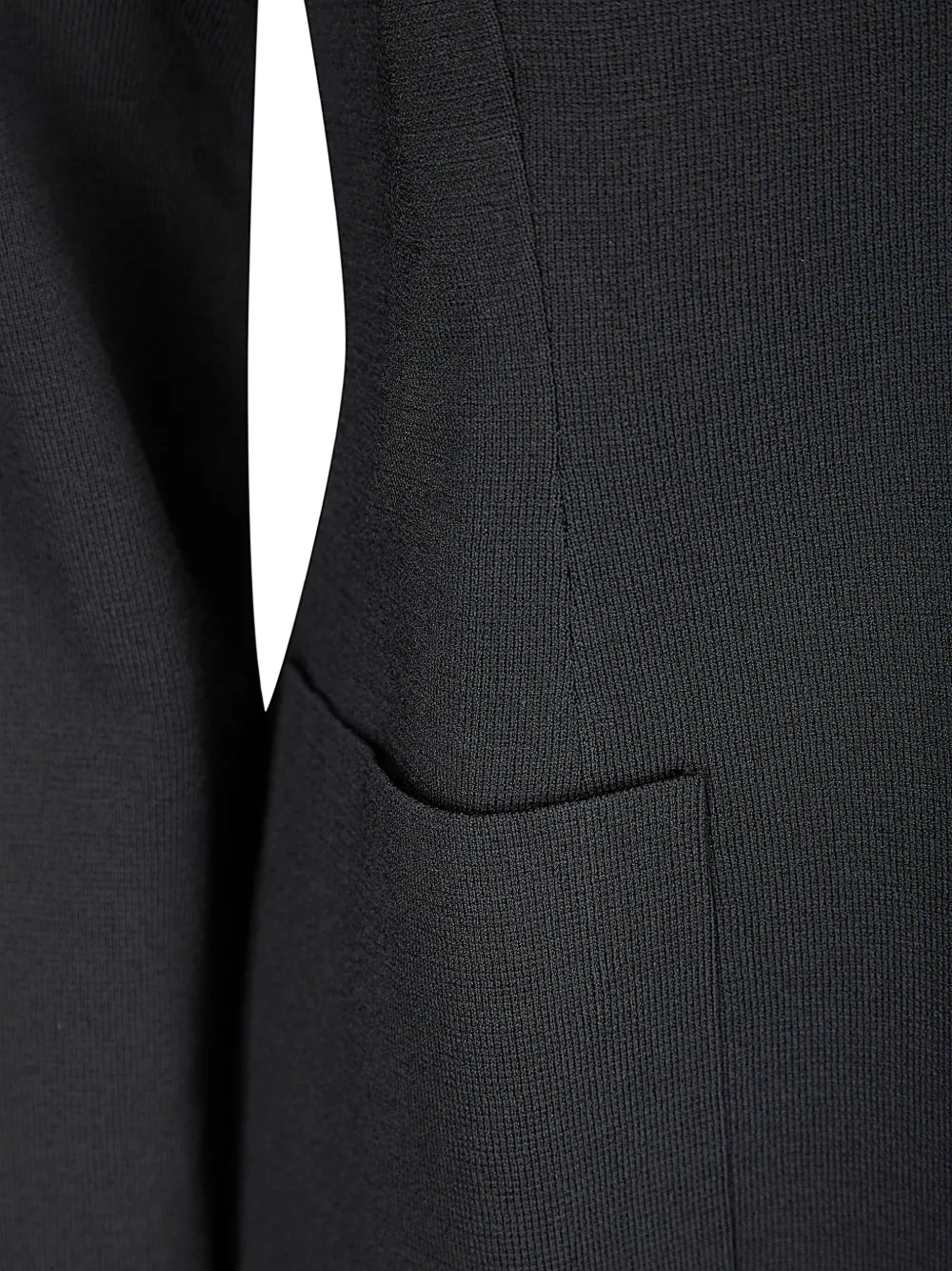 Черные накладные карманы, застежка на пуговицы, длинные рукава, лацканы с вырезом