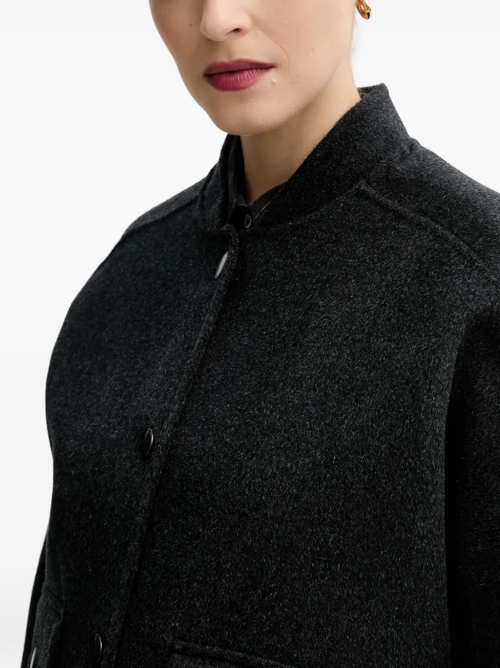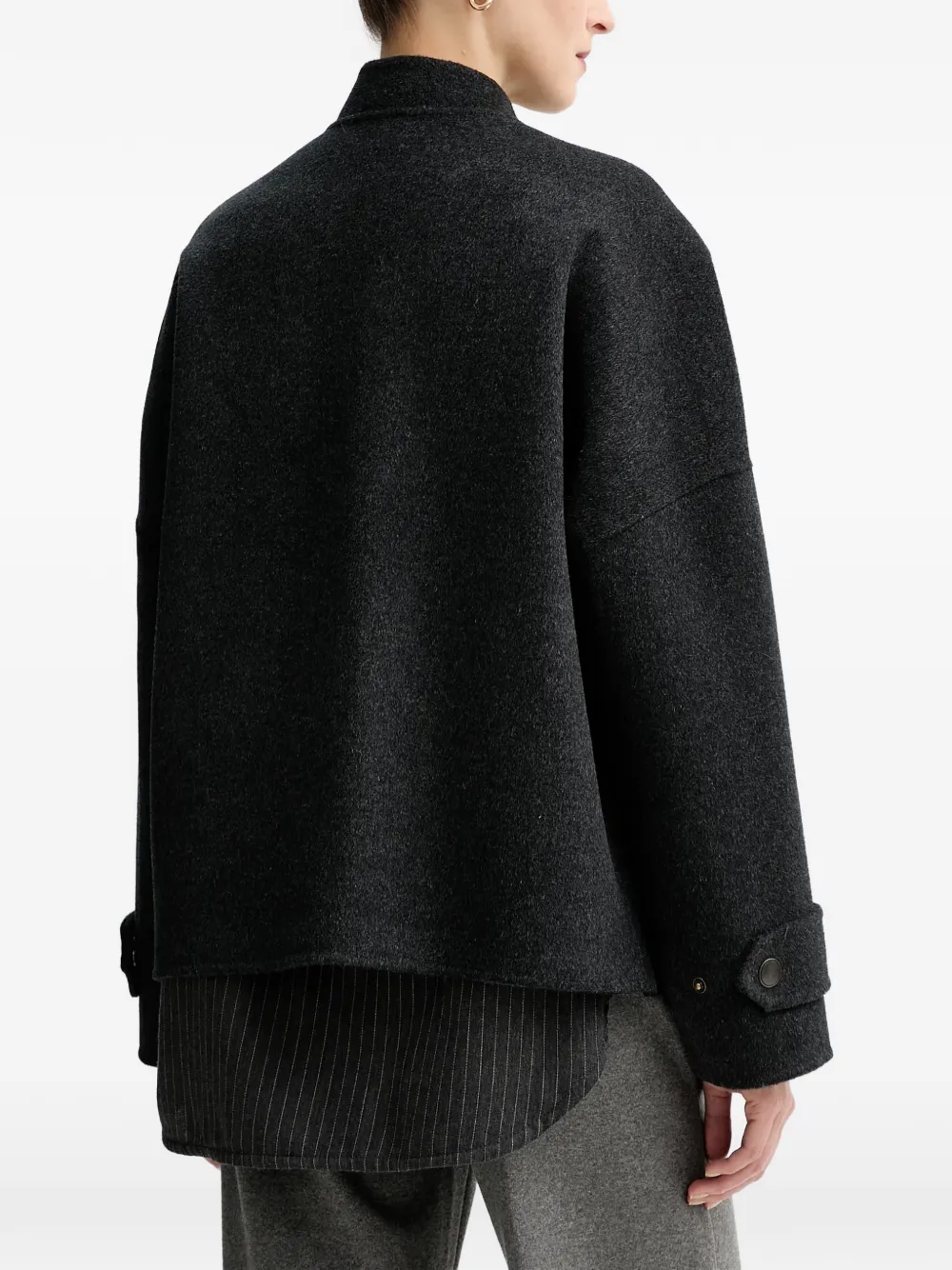 Серый цвет, застегивается спереди на пуговицы, два накладных кармана спереди, воротник-стойка, длинные рукава, манжеты на пуговицах