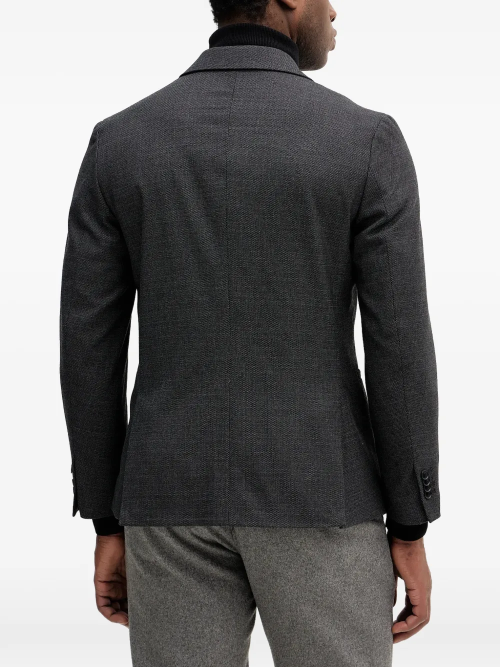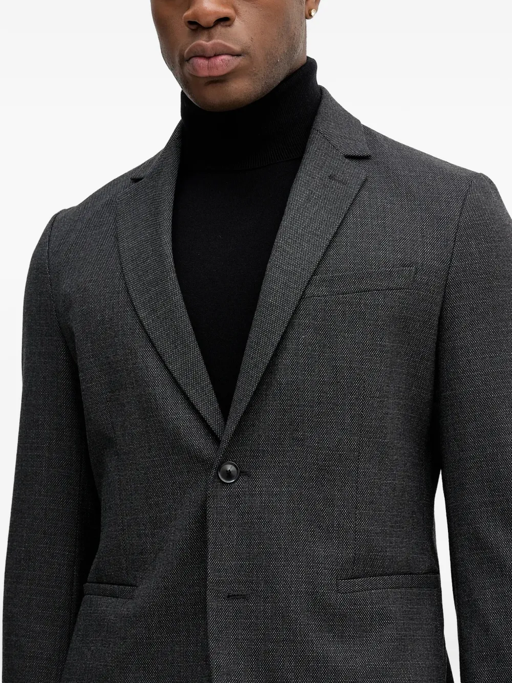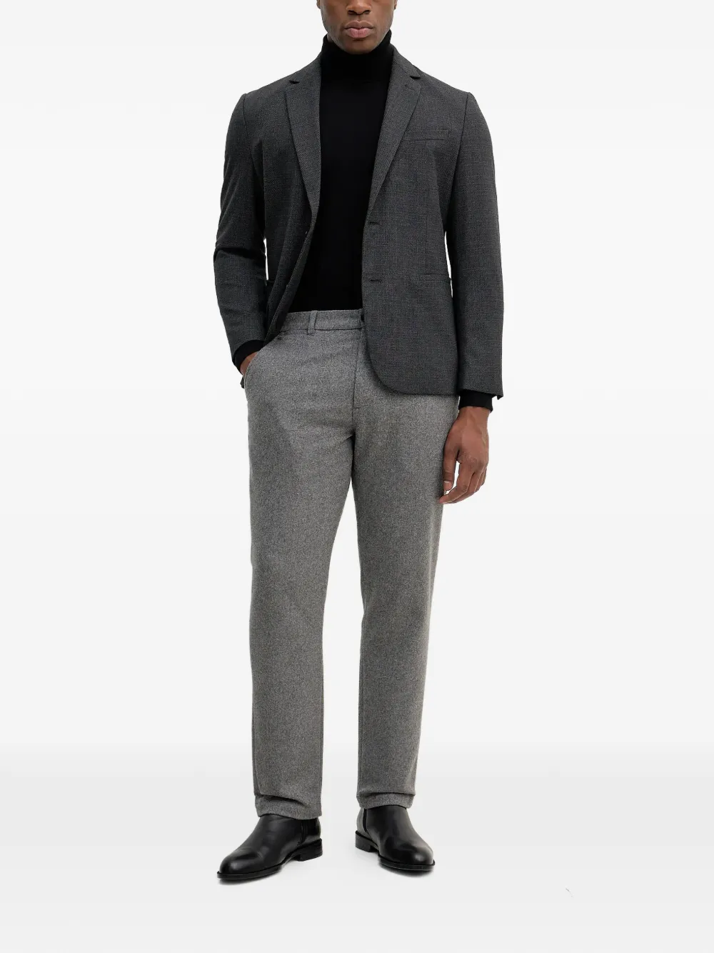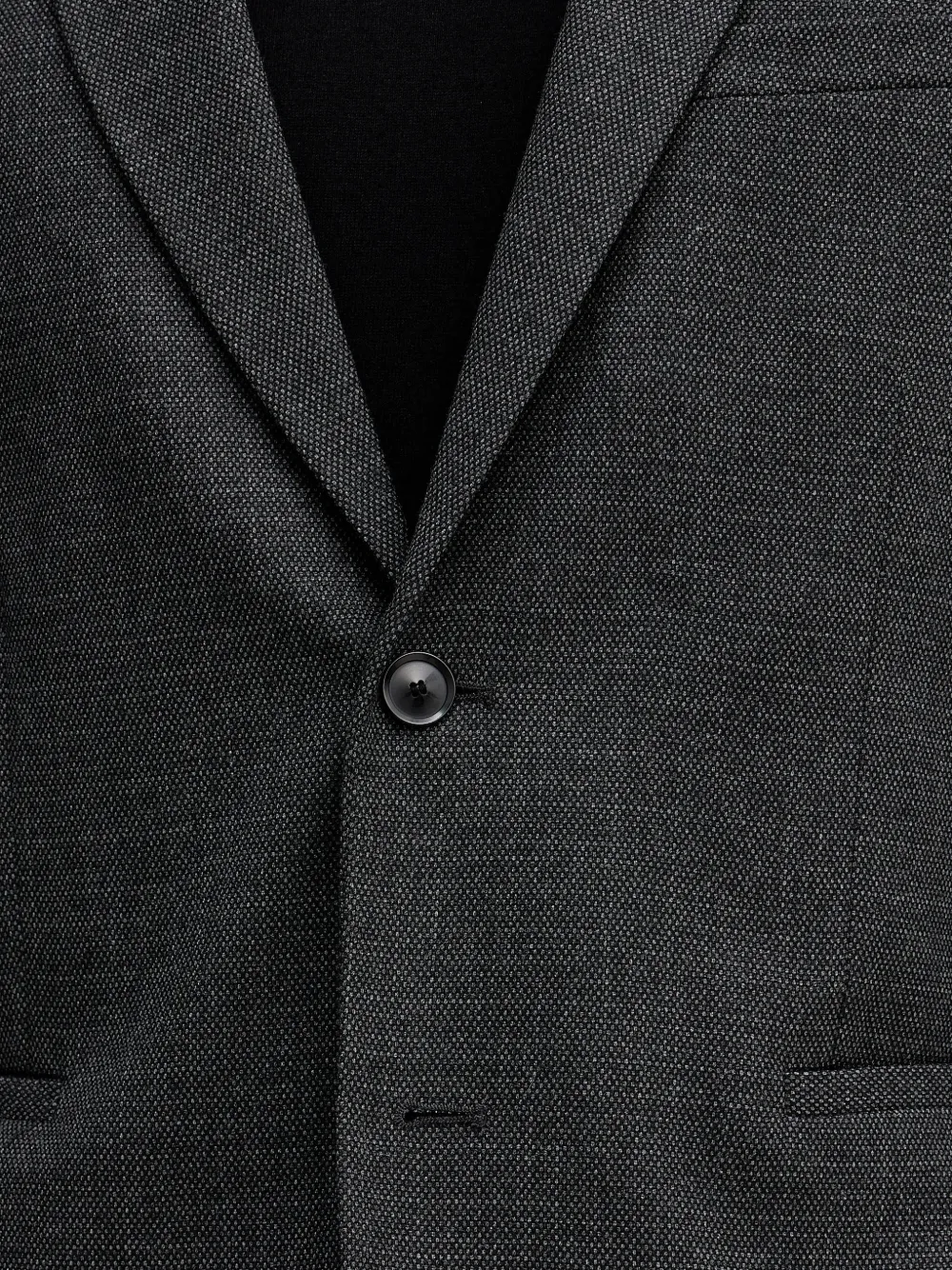 Угольно-серый цвет, застежка на пуговицы, лацканы с вырезом, прорезные карманы, длинные рукава, манжеты на пуговицах