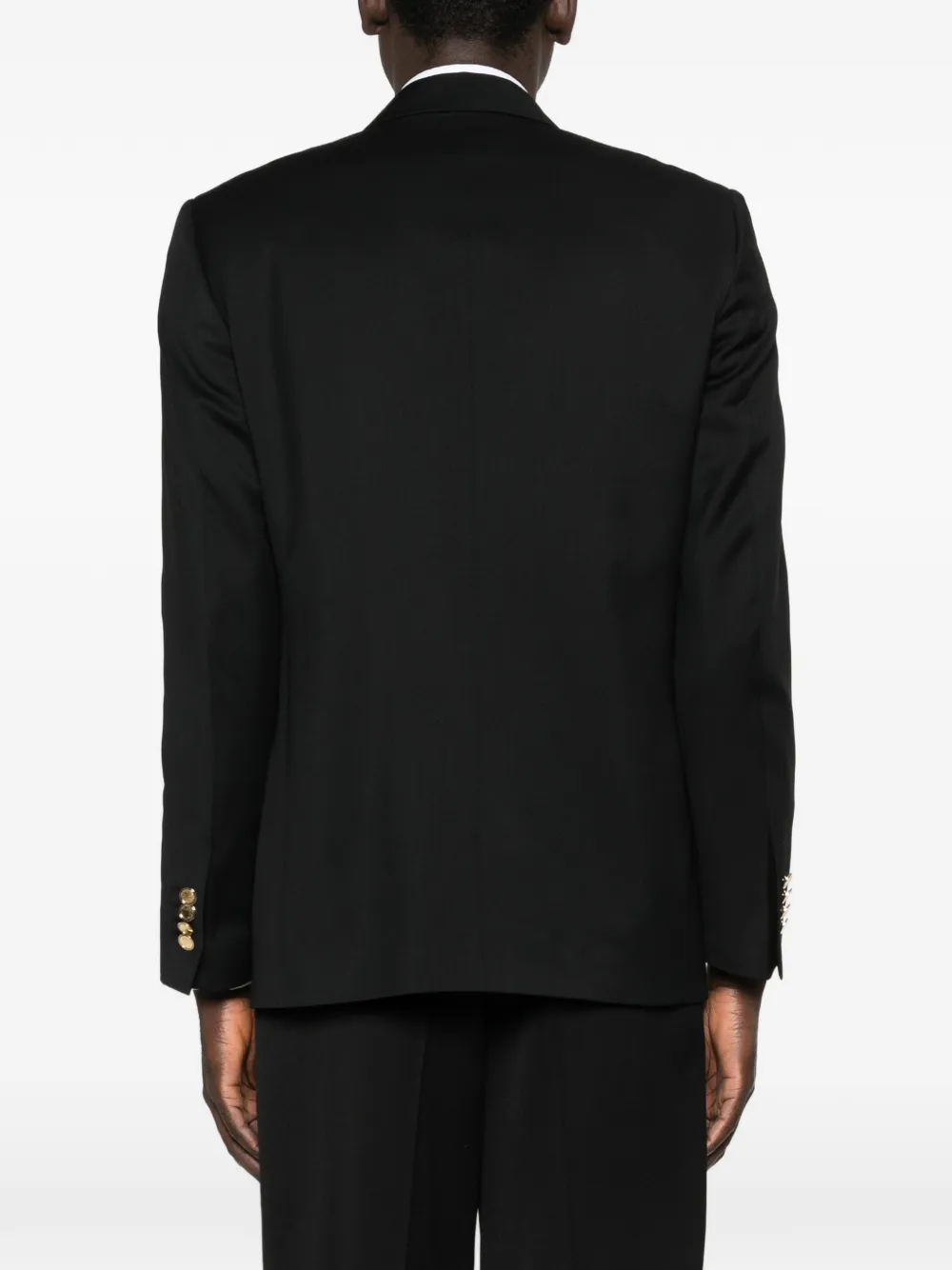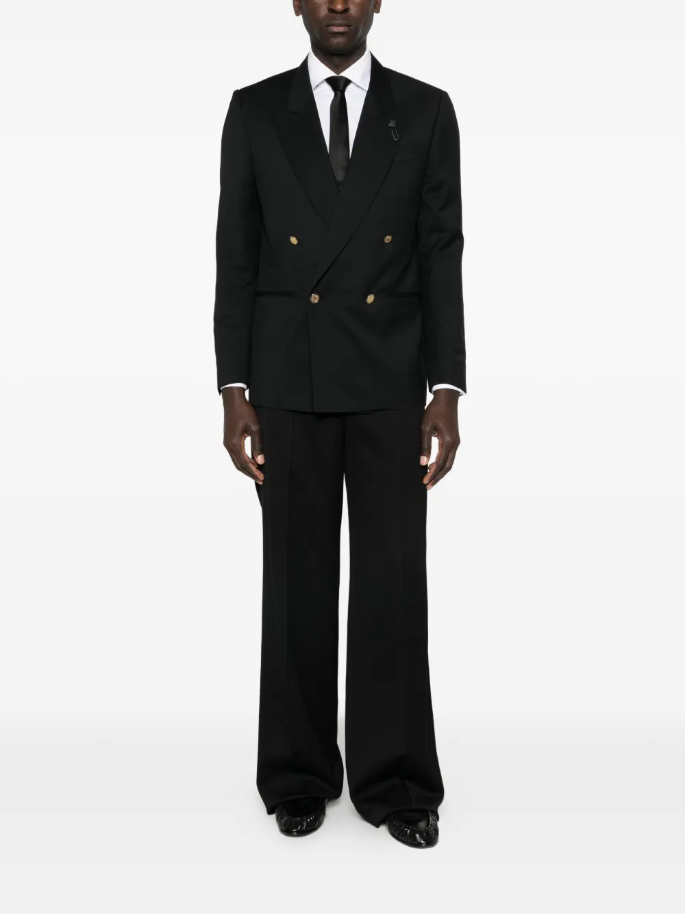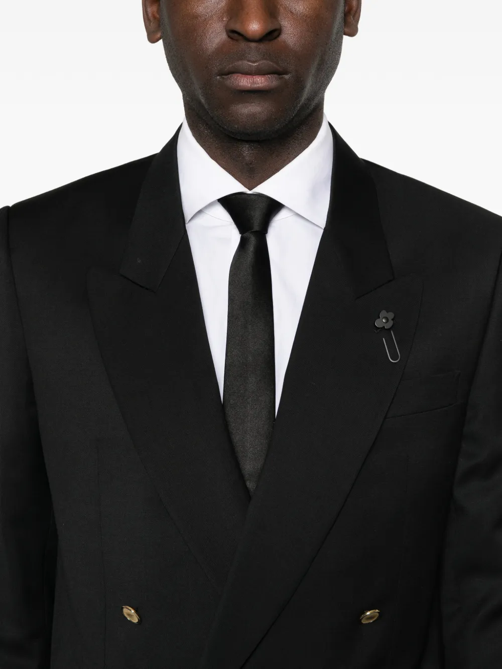 Черные острые лацканы, двубортный, передние карманы, длинные рукава