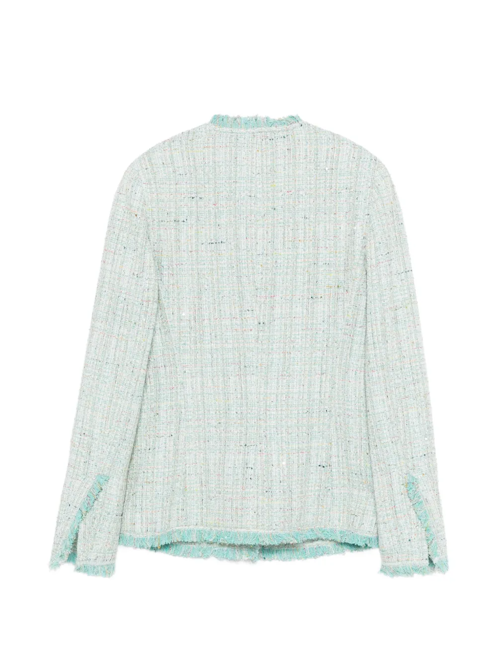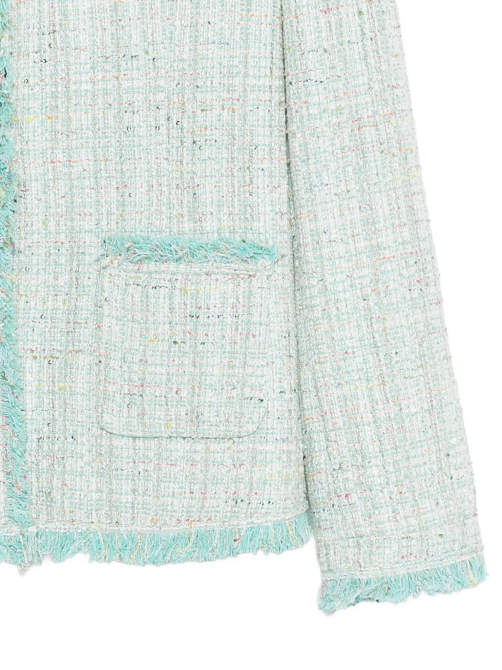 Бледно-бирюзовый твидовый эффект, четыре накладных кармана спереди, отделка бахромой, длинные рукава, V-образный вырез